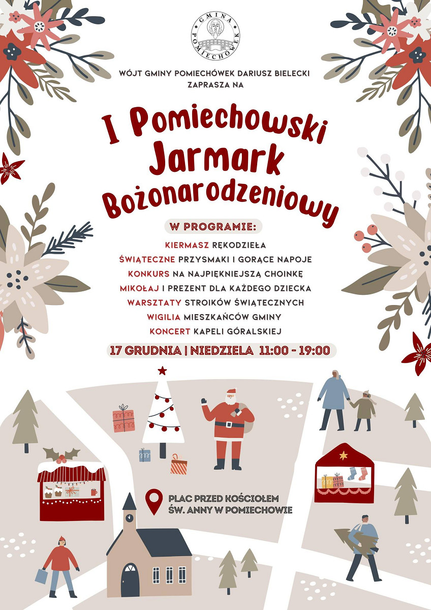 17 grudnia na pacu św. Anny w Pomiechowie odbył się 1 Pomiechowski Jarmark Bożonarodzeniowy połączony z wigilią mieszkańców. Wszystkie atrakcje, które odbyły się w ramach Jarmarku wyszczególnione są na plakacie umieszczonym obok. Dodatkowa atrakcją nie wymienioną była obecność misia polarnego, który tańczył i fotografował się z uczestnikami Jarmarku. Poniżej oraz pod zamieszczonymi linkami znajdują się fotorelacje z wydarzenia.
