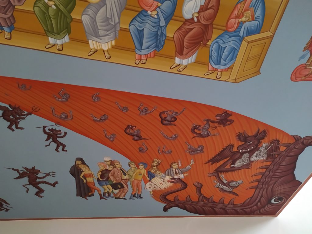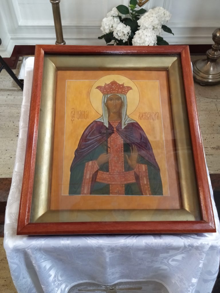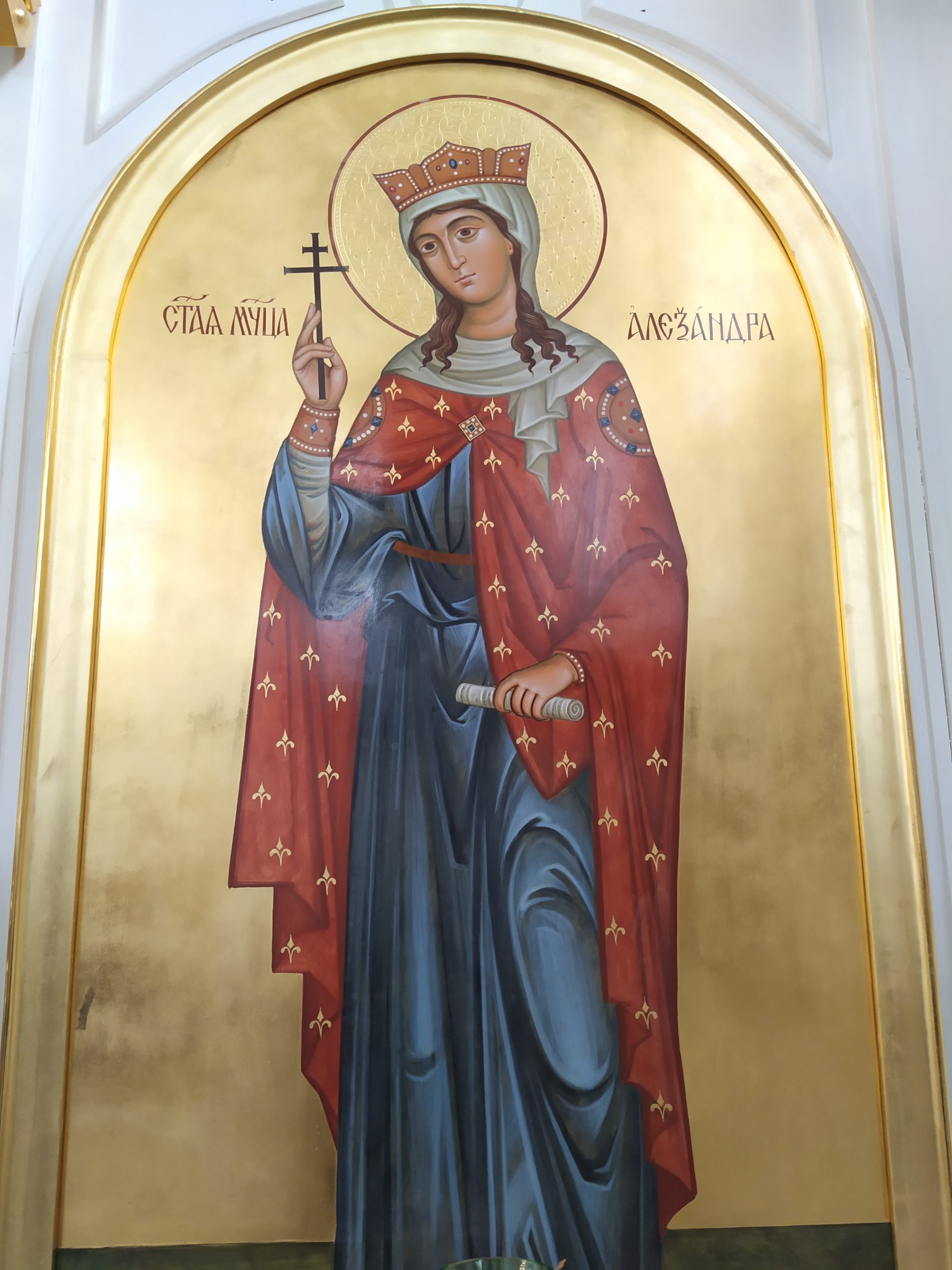 Cerkiew św. Aleksandry, 2022 – galeria dar wdzięczności Bogu w 80-tą rocznicę istnienia cerkwi (2018) św. Jerzy Zwycięzca, patron nieistniejącej cerkwi w Twierdzy archanioł Michał św. Aleksandra Rzymianka, patronka ikona św. Aleksandry, patronki cerkwi. Ikona pochodzi ze starej świątyni freski na ścianie po prawej przedstawiają świętych mężów. (na przeciwległej ścianie widać święte niewiasty) cudowna ikona Zmartwychwstania widok na ołtarz przez otwarte carskie wrota ikona pochodzi z nieistniejącej kaplicy cmentarnej ikona św. Andrzeja, dar patriarchy aleksandryjski Piotra VII fresk pod chórem: Dzień Sądu Ostatecznego domniemany grób jednego z wcześniejszych proboszczów