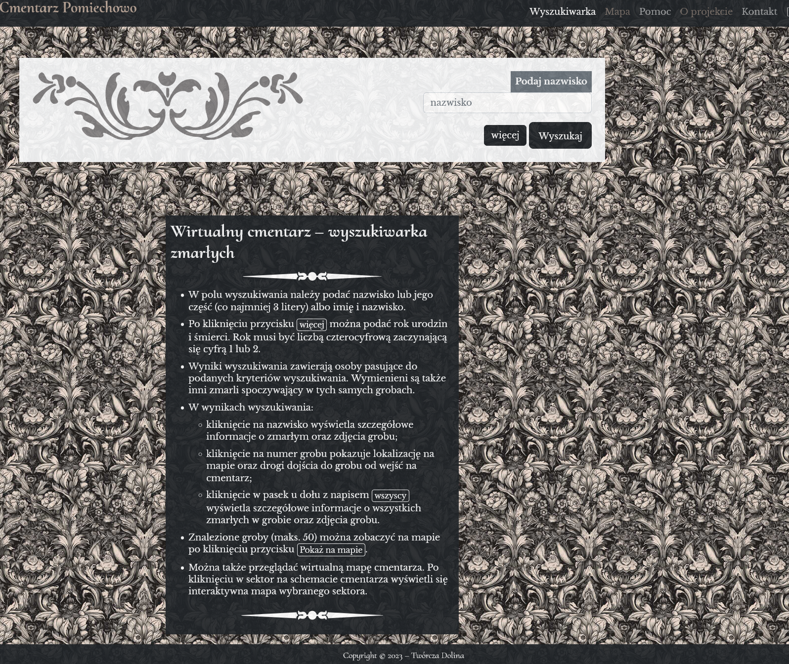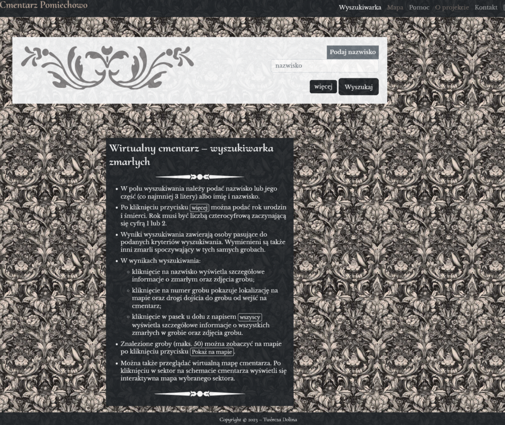Powyższy link przenosi na stronę, która jest bazą danych uzyskanych po inwentaryzacji cmentarza w Pomiechowie. Przez ponad rok od października 2022 roku do listopada 2023 roku Stowarzyszenie Twórcza Dolina realizowało projekt „Wirtualny cmentarz w Pomiechowie”. 13 wolontariuszy spisywało i fotografowało wszystkie nagrobki. Następnie pozyskane dane zostały umieszczone na stronie cmentarza, która jest specjalnie opracowana bazą danych o cmentarzu, ale też ma być baza wiedzy o wszytstkich pochowanych na pomiechowskim cmentarzu. W bazie przewidziano miejsce na informacje o zmarłych, na zdjęcia, wspomnienia, dokumenty. Zapraszamy wszystkich, którzy chcieliby upamiętnić swoich zmarłych i podzielić się informacjami o nich do kontaktu (informacje na stronie cmentarza). Baza jest cała czas poprawiana i uzupełniana o aktualne pochówki. czekamy też na informacje o ewentualnych pomyłkach lub brakach w spisie.