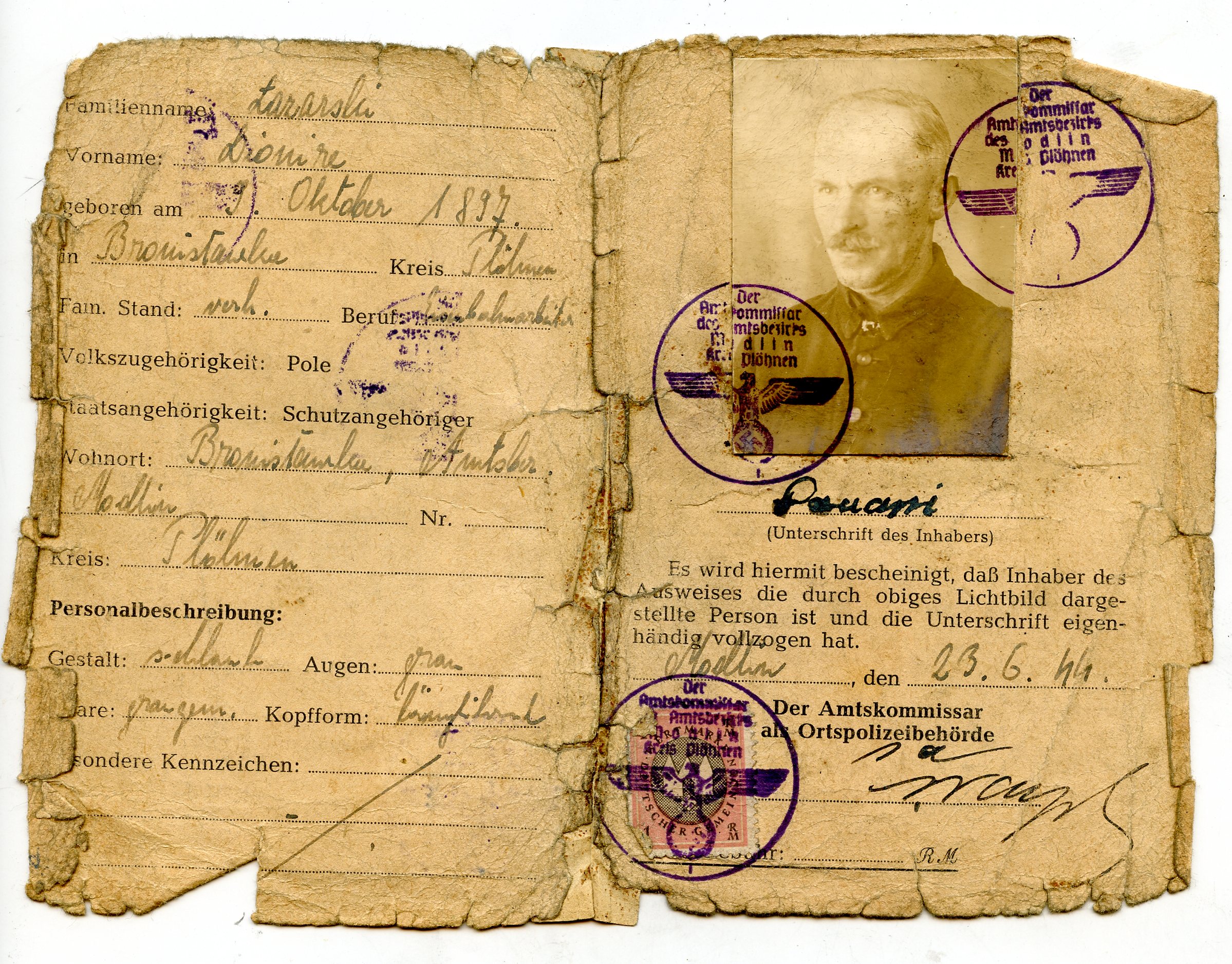 Dokumenty p. Grażyny Włodarczyk Ausweis (dokument tożsamości) wydawany w czasie drugiej wojny światowej, przez władze niemieckie. Prezentowany dokument był własnością Dionizego Łazarskiego. Okładka prezentowanego obok dokumentu.