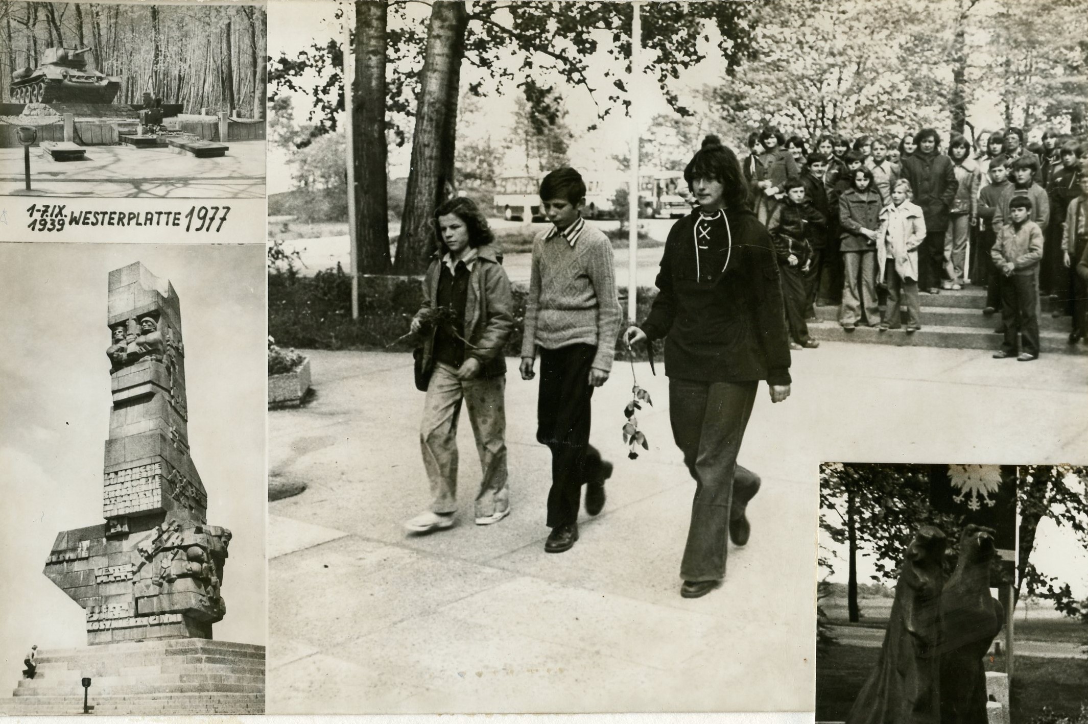 Delegacja szkoły, składa kwiaty pod pomnikiem obrońców Westerplatte. Od lewej: Jolanta Rudnicka, kl. VIII, Sławomir Szajkowski kl. VII, Agnieszka Sawicka kl. VII