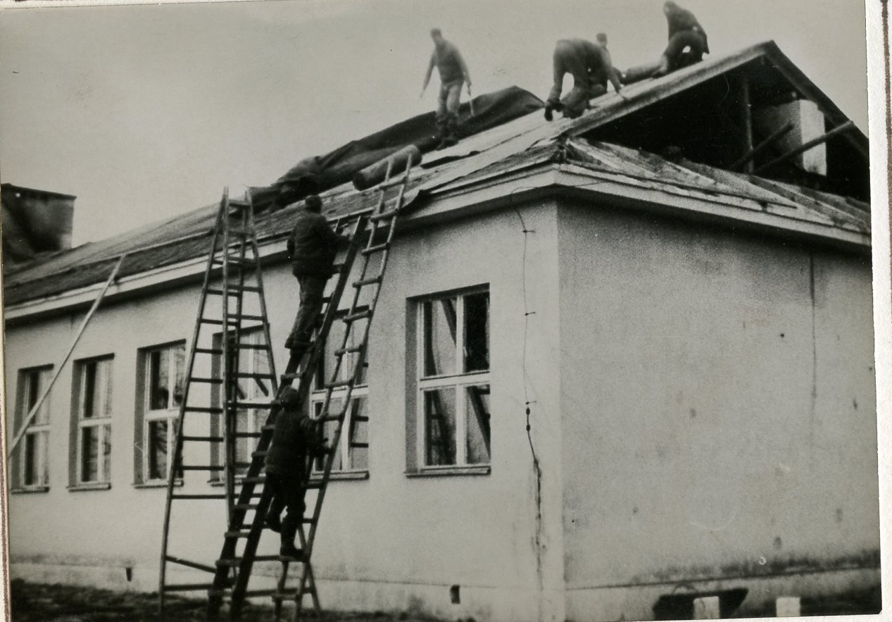 Naprawa zniszczonego dachu budynku szkoły.