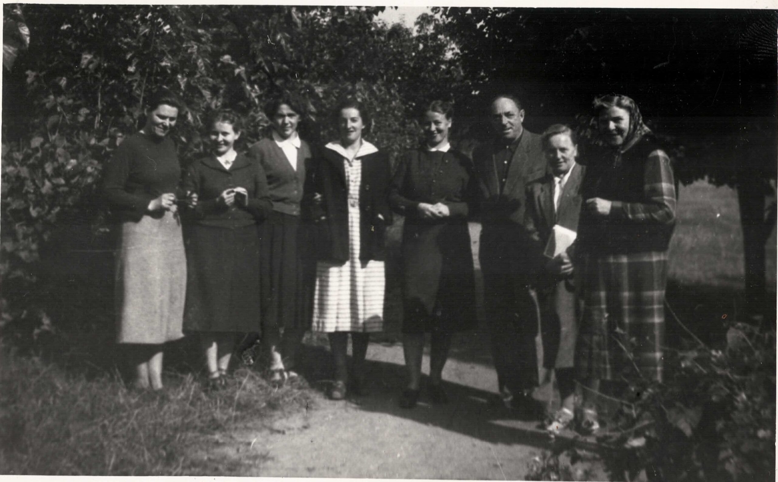 Galeria S.P. Pomiechówek 1945 – 1946 Grono nauczycielskie. 20 IX 1956 r. IJ. Rozpoznano: druga od lewej Ineza Jarosz, następnie Cyryla Regulska, Krystyna Łakomy, Janina Regulska i za dyrektorem stoi Genowefa Motylińska.