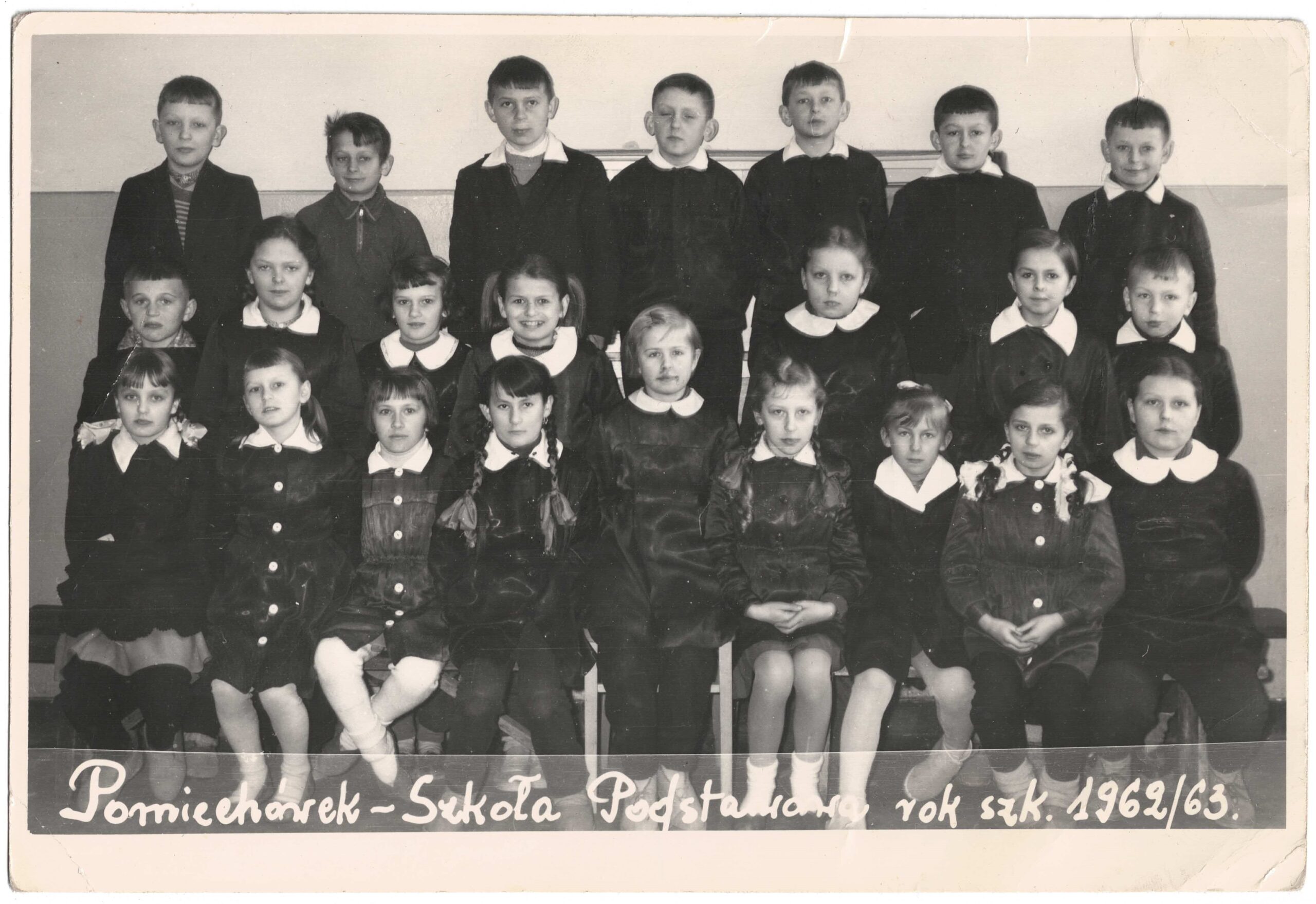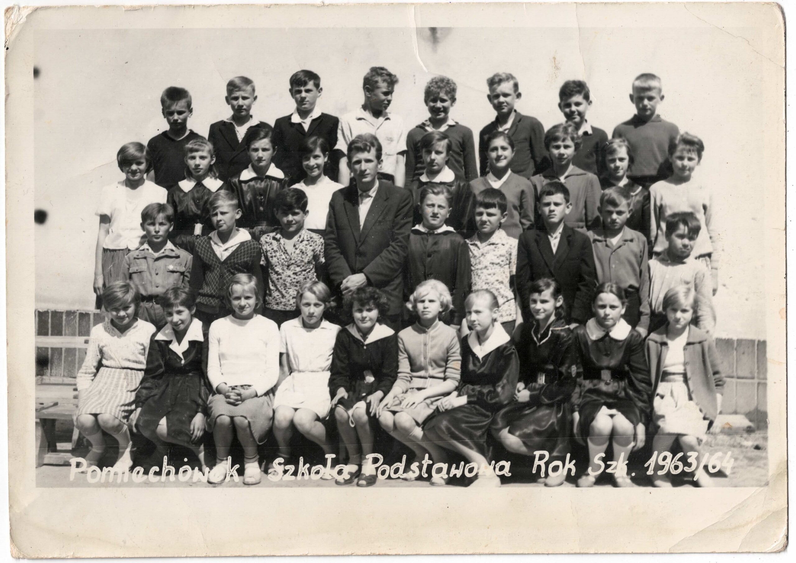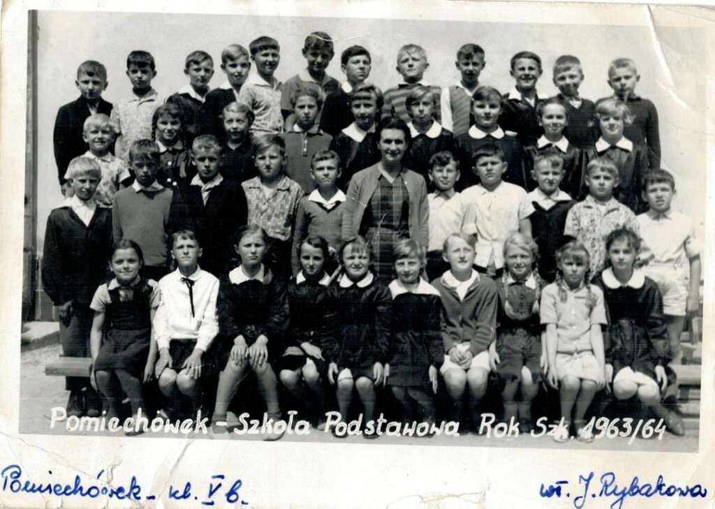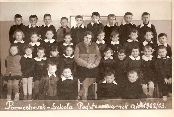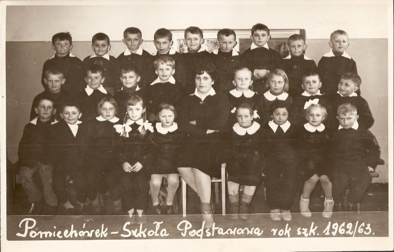 Foto z albumu Marka Jakubiaka. 1963 r. wychowawca klasy p. Kujawski. Na zdjęciu od lewej stoi Jola Łabęda, potem Rysia……..? ,Teresa Pełda, Ania Tyska, Jola Kaniewska, ŚP-Ela Nerć, Asia Ganowska, ŚP – Pan Kujawski, Jadzia Tomaszewska, Grażyna Romankiewicz, Basia Wątrucka, Ewa Cisak, ŚP – Ania Krupko, Gabrysia Marciniak, Marysia Korytowska. Drugi rząd z lewej Jadwiga Piórkowska, a z prawej Ewa Krupińska. Siedzą od lewej Andrzej Malasiewicz, ŚP – Wiesiek Lalik, Włodek Sobieszek , trzyma Marka Jakubiaka, Andrzej Falak, Andrzej Grzybowski, Włodek Kloc, ŚP – Tadek Łuszczewski nad nim pół głowy Janek Cybas, ŚP – Marek Arbaszewski, poniżej Jurek Błoński, nad nim Krzysiek Nerć, ŚP -Piotrek Żmijewski i na końcu chyba Krzysiek Peczyński. Dwóch na przedzie z lewej ŚP- Zbyszek Choma i Kazik Sękowski.. Brakuje jeszcze Krysi Rosłońskiej, Grażynki Pająk wyprowadziła się do Płocka, Jurka i Bogdana Pietrowów, Grześka Falaka, Wacka Sękowskiego
