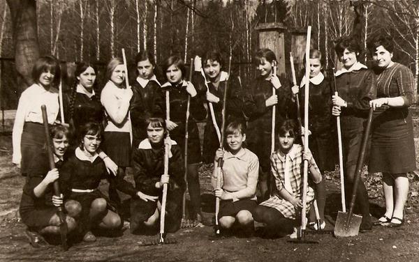 Wiosenne prace porządkowe na terenie szkoły. szefowa akcji Benigna Rybak. 1966 r. rocznik klasy 1953.