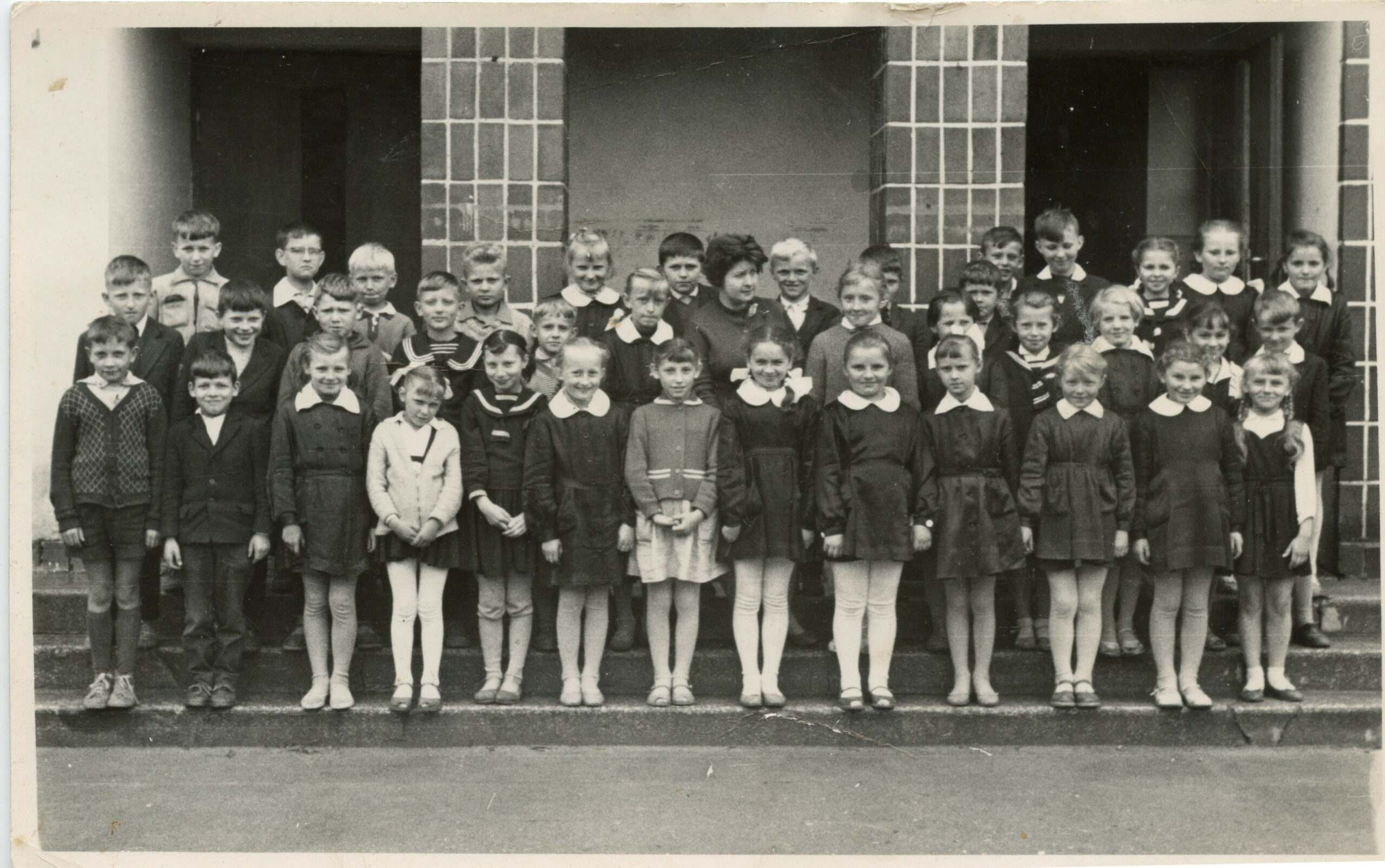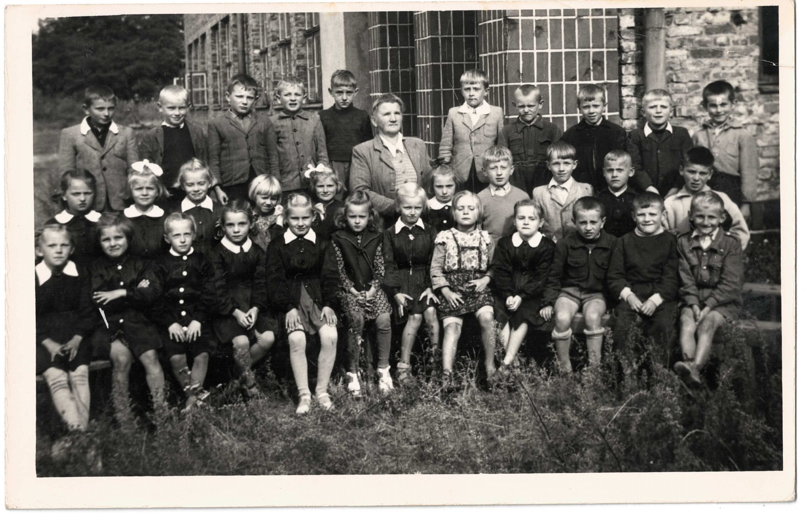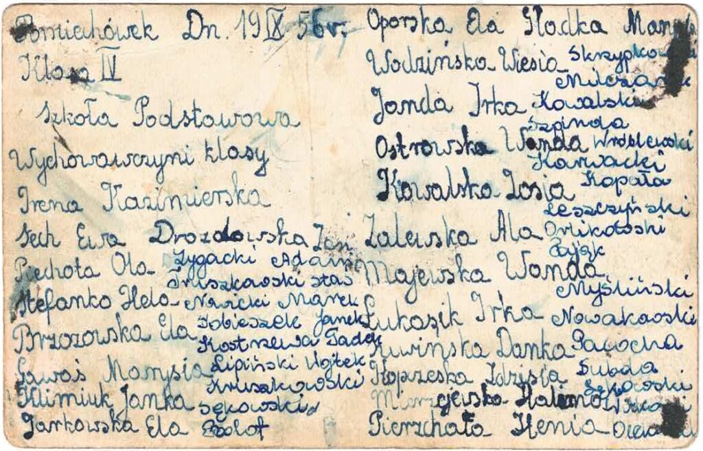 w/g Marka Jakubiaka, zdjęcie może pochodzić z roku szkolnego 1958/59. rocznik 1948, klasa p. Marii Budkiewicz – na zdjęciu. Uczniowie od lewej górny rząd: Eugeniusz Owocki, Stanisław Zalewski, Jan Pietrzak, Józef Szafrański, Jerzy Pająk, Drugi rząd od góry od lewej: (?) Calak, Barbara Leszczyńska, Orlikowska, Ryszard Jakubiak, Andrzej Pająk. W pierwszym rzędzie od lewej: Ela Łęgowska, (?) Pisarek, Grażyna Sołtysik, (?) Grunczewska, (?) Motylińska, Stanisław Mazurek, Witold Deręgowski. Zdjęcie z albumu Grażyny Budkiewicz.