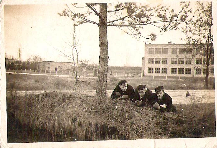 Trzej młodzieńcy na tle szkoły w Pomiechówku. Pierwszy z lewej Ryszard Kruszewski 1947 r. Z albumu Grzegorza Szklarka.