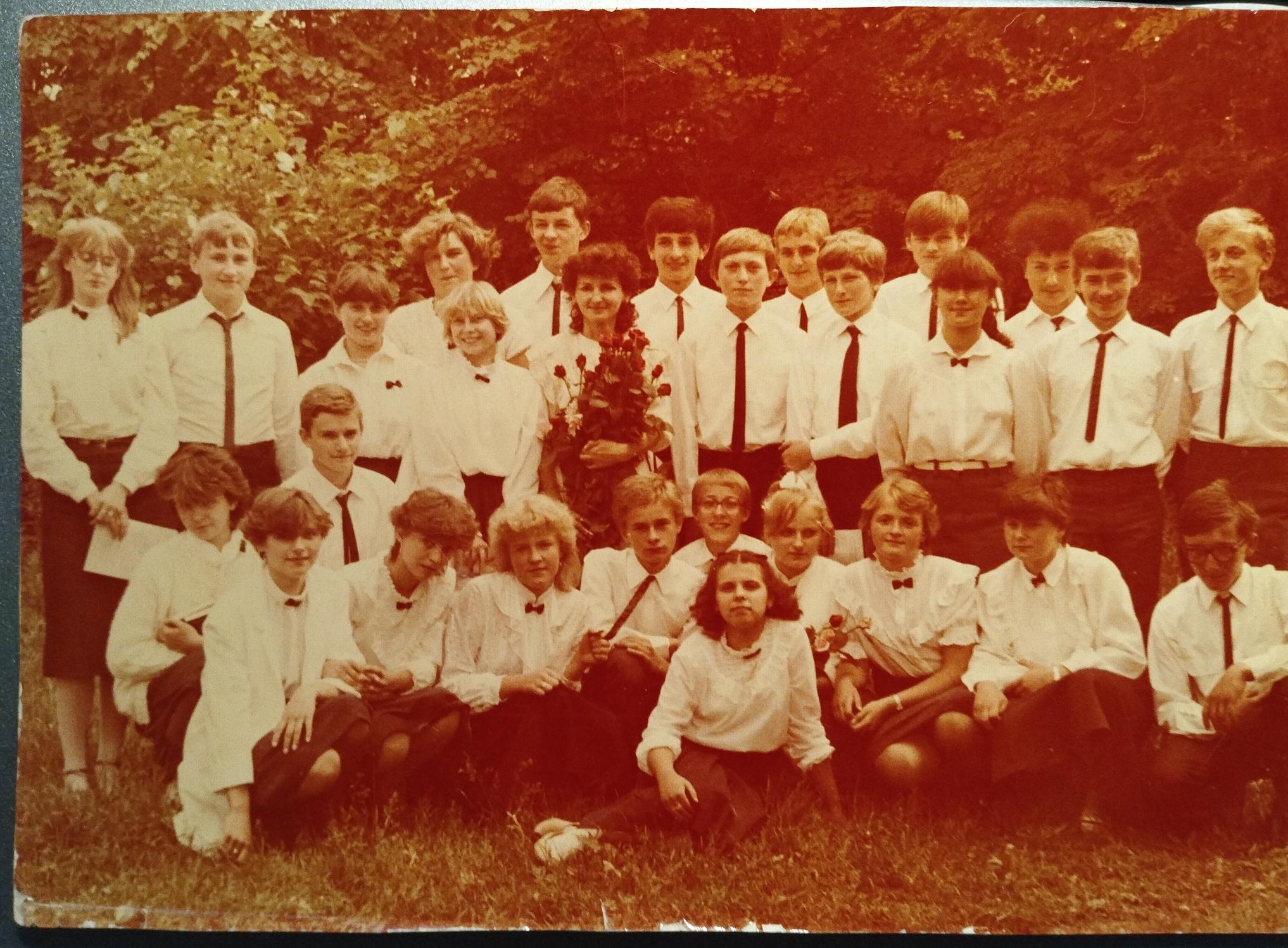 1985 r. Kl. 8 Wychowawca Wanda Cichocka. Uczniowie: Ewa Bartosiewicz, Jan Chmielewski, Monika Cichocka, Agnieszka Drzazga, Krzysztof Fabisiak, Mariusz Filipiak, Agnieszka Golec, Sławomir Goszczyński, Agnieszka Grzegorzewska, Dariusz Gołuch, Kasia Malinowska, Beata Kiliś, Magda Kuciak, Leszek Kurowski, Anita Mróz, Magda Ochocka, Robert Oczak, Arkadiusz Pawlak, Kasia Pawlicka, Monika Piwko, Mariusz Proch, Magdalena Pysiewicz (Cichocka), Magda Rybarska, Jacek Skowroński, Marek Szczęsny, Iza Szymańska, Mariusz Tatara, Jacek Wojciechowski, Grzegorz Wójcik. Zdjęcie z albumu Leszka Kurowskiego.