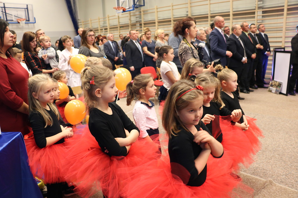 W piątek 15 grudnia odbyła się uroczystość otwarcia nowej hali sportowej przy Szkole Podstawowej im. Wandy Chotomskiej. Dyrektor szkoły Marzena Bryjak podziękowała inicjatorowi inwestycji wójtowi gminy Dariuszowi Bieleckiemu oraz wszystkim, którzy przyczynili się do ukończenia tego ważnego zadania. Wójt wyraził wdzięczność wobec rady gminy. Zwrócił uwagę, że niniejsza inwestycja jest świetnym wyrazem prawdy, że zgoda buduje.