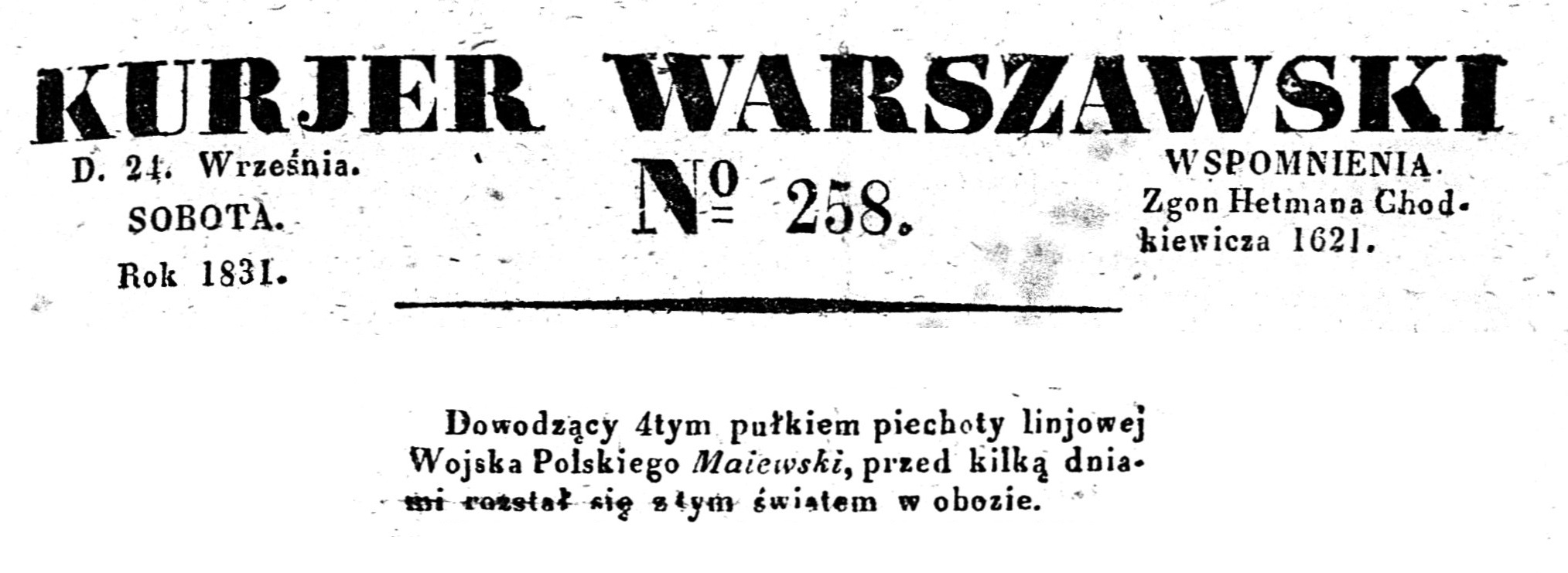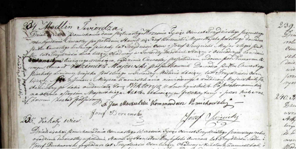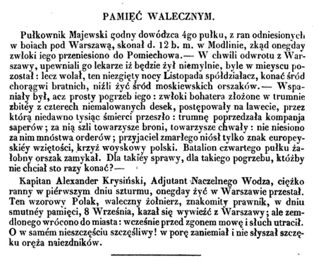 Kazimierz Roman Majewski urodził się 3.03.1789 r. w dworze Miłocice, parafia Słomniki w woj. krakowskim. Jego ojciec Stanisław Majewski był tam oficjalistą. Mama Antonina pochodziła z rodziny Zielińskich. Kazimierz był jednym z szóstki dzieci. W armii Księstwa Warszawskiego służył od 1809 r., jako sierżant 15 pp. 20.07.1811 awansowany do stopnia podporucznika, a 28.08.1812 porucznika. Odbył kampanię 1812 r. (Smoleńsk, Możajsk, Tarutino, Medynia, Czirikow, Wiaźma, Krasne, Berezyna), za którą otrzymał krzyż złoty. Został wzięty do niewoli rosyjskiej nad Berezyną, z której został zwolniony w kwietniu 1814. Był Członkiem Towarzystwa Patriotycznego. W armii Królestwa Polskiego służył od 02.02.1815 jako porucznik 4 pułku piechoty liniowej. Od 03.02.1817 jako kapitan. 24.05.1830 otrzymał znak honorowy za 15 lat nieskazitelnej służby. Aktywnie uczestniczył w Nocy Listopadowej, dowodząc 5 kompanią fizylierską. 06.02.1831 awansowany do stopnia majora, a 20.06.1831 podpułkownika. Odznaczony krzyżem złotym Virtuti Militari nr 316, a następnie krzyżem kawalerskim nr 408. Został tymczasowym dowódcą Czwartego Pułku Piechoty Liniowej Królestwa Kongresowego („czwartacy”). Zmarł w Modlinie z ran odniesionych w drugim dniu szturmu na Warszawę. Został pochowany z honorami na cmentarzu w Pomiechowie. Opis pogrzebu znajduje w wydawanej w 1831 roku w Zakroczymiu Gazecie Narodowej. Link do Gazety poniżej, zamieszczony opis pogrzebu znajduje się w numerze 5.