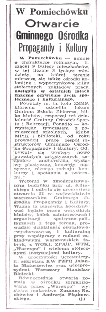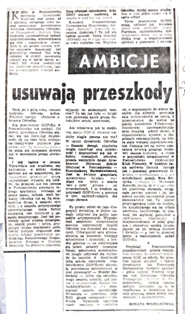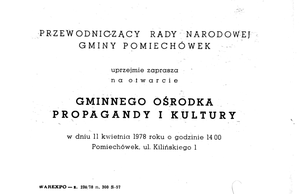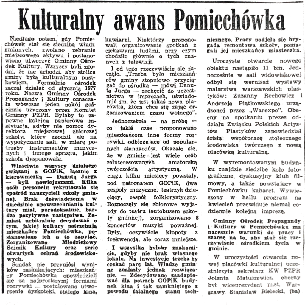 Prace w ośrodku rozpoczęliśmy od zebrań otwartych. Informowaliśmy społeczeństwo Pomiechówka czym będzie się zajmować nowa instytucja, jaką rolę w środowisku będzie spełniać. Przeważającą część słuchaczy stanowiła młodzież. Przy jej pomocy podjęliśmy próbę ustalenia, jakie formy kulturalne na terenie naszej miejscowości będą odpowiednie, na jakie istnieje zapotrzebowanie. Wnioski ze spotkań były jednoznaczne – istniało zapotrzebowanie na kulturę tak zwaną masową, najprostszą, docierającą do wszystkich. Organizowane co dwa tygodnie wieczorki taneczne stały się okazją nie tylko do zabawy, ale także formą zachęcenia młodych ludzi do udziału w innego typu imprezach, Wieczorkach w poezji, spotkaniach z literatami, koncertach Warszawskiego Towarzystwa Muzycznego, festynach, występach Estrady, wystawach. Akcja Szukamy Talentów miała skłonić młodzież do udziału w różnego rodzaju kółkach zainteresowań, zespołach. Niezwykle ważną sprawą był problem przejścia młodzieży do aktywnego uczestnictwa w życiu kulturalnym Pomiechówka. Powstało pomiechowskie koło ZSMP, które zrzeszając najbardziej czynną młodzież stworzyło możliwość szerszych kontaktów, przyczyniło się do koordynacji klubów na terenie gminy, zorganizowania szeregu imprez i czynów społecznych. Do tej pory praca tego koła jest ściśle związana z pracą GOPiKu. W ciągu kilku miesięcy (do grudnia 77) zorganizowaliśmy 8 koncertów WTM, 4 występy Estrady, 14 występów własnych zespołów artystycznych, liczne wyjazdy do teatrów warszawskich, konkursy, spotkania z literatami, kombatantami, podróżnikami, dyskoteki, wystawy plastyczne. Uczestniczyliśmy jako ośrodek w rejonowych i wojewódzkich przeglądach zespołów. Gościliśmy na terenie Pomiechówka między innymi Wojciecha Żukrowskiego, Minkowskiego, Jaworskiego, Dworczyka, Chlebowskiego, Polę Raksę, redaktora Żmigrodzkiego, redaktora Gutkowskiego, Igora Śmiałowskiego, Lorentowicza – twórcę ludowego. Byliśmy współtwórcami, współorganizatorami imprez o wyjątkowej randze dla naszej miejscowości: dni Pomiechówka obchodzonych od 1 do 4 września oraz akademii z okazji 60 rocznicy Wielkiej Socjalistycznej Rewolucji Październikowej. W dotychczasowej pracy nawiązaliśmy kontakty ze stołecznym i rejonowym zarządem TWP, Biurem Wystaw Artystycznych, Przedsiębiorstwem Turystycznym Arena, Teatrem Dramatycznym w Warszawie, wspomnianym już WTMem – Estradą. W obecnej chwili pracują w GOPiKu stałe zespoły i koła zainteresowań: dwa zespoły muzyczne, jeden z nich zajął czwarte miejsce w Mokotowskiej Jesieni Muzycznej, teatrzyk muzyczny stworzony na bazie rytmiki dziecięcej, zespół teatralny złożony z dzieci starszych klas szkoły podstawowej, folklorystyczny zespół taneczny skupiający młodzież dorosłą, głównie z PGR-u, koło literackie, stawiający pierwsze kroki kabaret oraz klub sympatyków Melpomeny. O rocznej imprezie Gminnego Ośrodka Kultury i Propagandy pisze na łamach „Naszej Trybuny” Renata Wojdanówna.