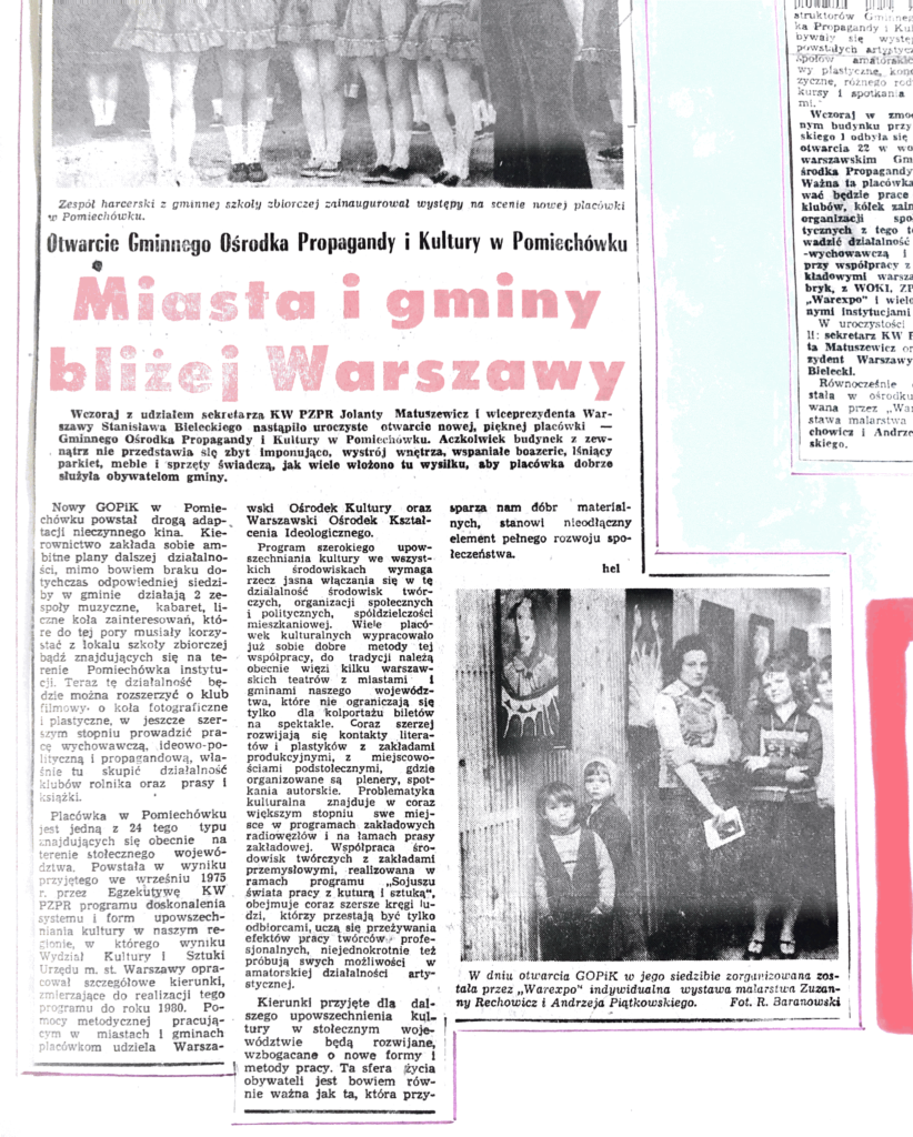 GOPiK czyli Gminny Ośrodek Propagandy i Kultury powołano z dniem 1 stycznia 1977 roku. Warszawski Ośrodek Kultury przydzielił budżet, wygospodarował etaty. Już w następnym miesiącu odbył się Młodzieżowy Sejmik Kultury, na którym spotkali się gospodarze Gminy z aktywem młodzieży. Debatowano nad aktualną sytuacją kulturalną w gminie. Zgłoszono wnioski pod adresem mobilizującego się do aktywnej pracy GOPiKu. Wiele z tych sugestii zostało uwzględnionych w sformułowaniach końcowych spotkania. W kwietniu kadra Gminnego Ośrodka Propagandy i Kultury była już w komplecie. Pracę swą rozpoczęliśmy z wielkimi nadziejami, aczkolwiek w dość specyficznych warunkach: brak było pomieszczeń i sprzętu. Zamieszkaliśmy w pokoju Komitetu Gminnego. Sali, sprzętu, instruktorów, samochodu, użyczyła nam Zbiorcza Szkoła Gminna. Zainteresowanie okazały miejscowe instytucje i ośrodki wypoczynkowe. Systematyczny instruktaż otrzymywaliśmy od Warszawskiego Ośrodka Kultury. Dzięki tej pomocy już w maju 77 roku byliśmy w stanie zorganizować przegląd teatralnych zespołów dziecięcych, który stał się doskonałą okazją do wymiany doświadczeń artystycznych. W spotkaniu udział wzięli pracownicy WOK-u, reżyser Halina Machulska, opiekunka dziecięcego zespołu teatralnego z Ochoty oraz instruktorzy naszego ośrodka. Zespół rytmiki dziecięcej z Pomiechówka zaprezentował program pod tytułem Byczek Fernando. Występ został wysoko oceniony i stał się przedmiotem żywej dyskusji.