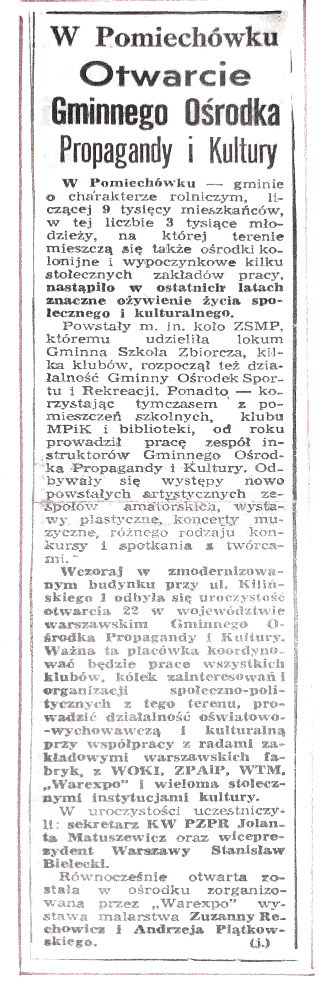 „Tłumnie, szumnie i odświętnie jest dziś w budynku przy ul. Kilińskiego. Na ścianach dużej, pięknie wykończonej boazerią sali wiszą obrazy artystów plastyków WAREXPO. Panuje niezwykła, pełna emocji atmosfera. Są już pierwsi goście, telewizja przygotowuje się do nagrania. Za chwilę o godzinie 14.00 nastąpi uroczyste przekazanie do użytku naszego Ośrodka, nowego obiektu. Program otwarcia przewiduje wystąpienie gospodarzy terenu, przemówienia gości, zwiedzanie wystawy i występ zespołu dziecięcego w programie pt. „Mazowsze moje.”