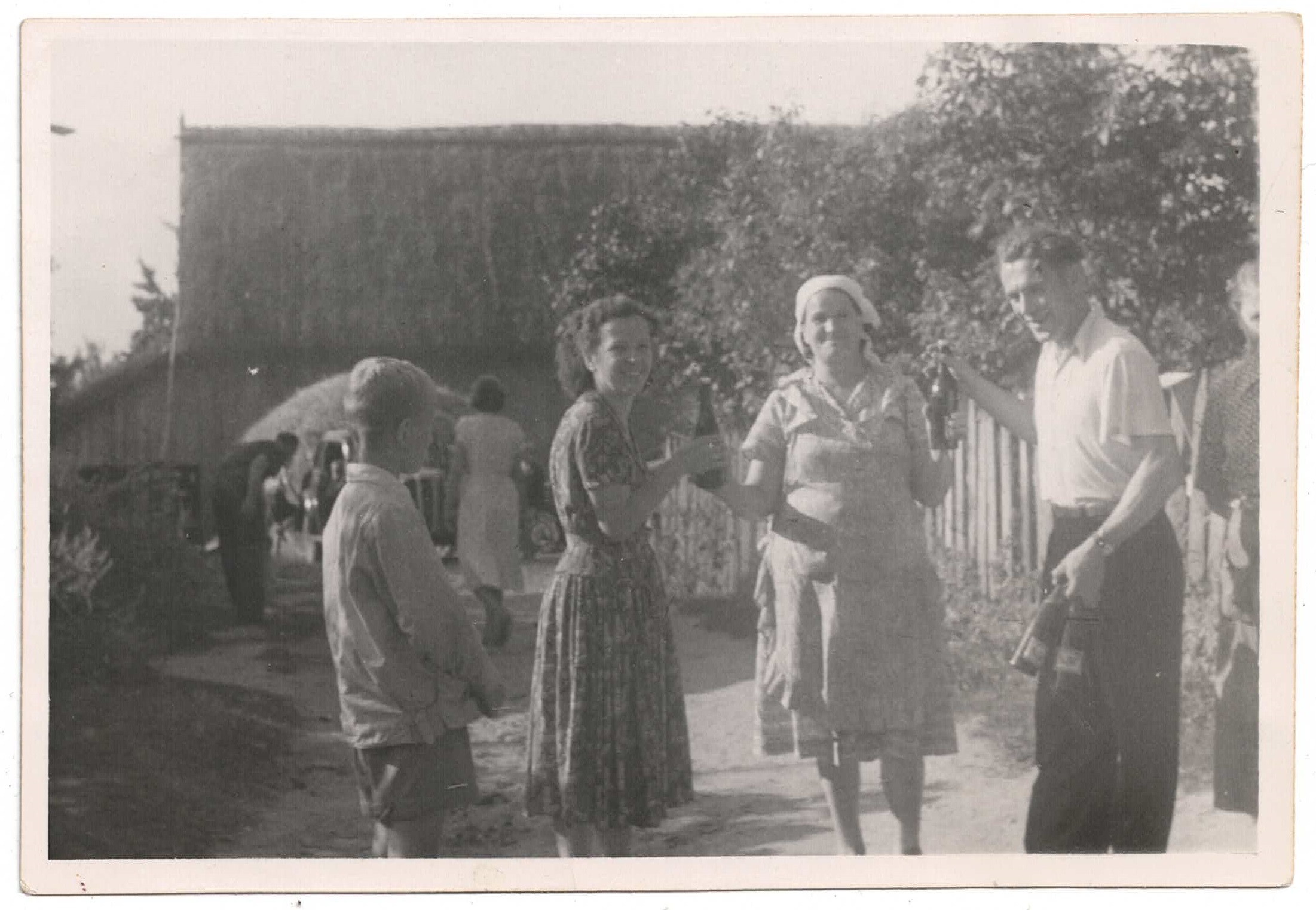 Kobieta z lewej to p. Bednarek, pierwsza powojenna nauczycielka S.P. w Kikołach. Pozostałe osoby, mąż p. Bednarek i Jadzia Jeziorkowska. Z albumu Jadwigi Pałac.