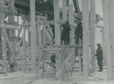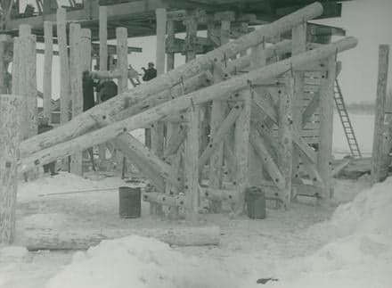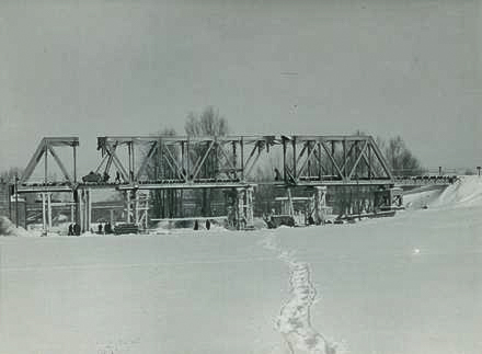 Naprawa zniszczonego we wrześniu 1939 r. mostu Kolejowego, na rzece Wkra w Pomiechówku. Zima 1940 r.