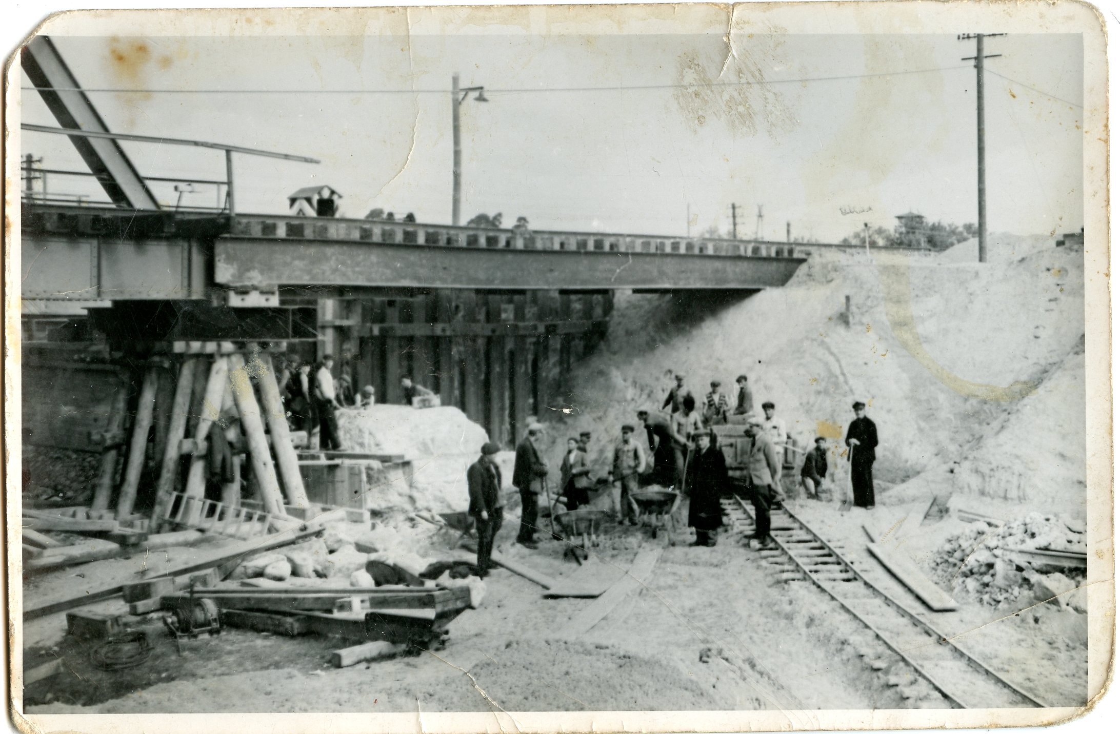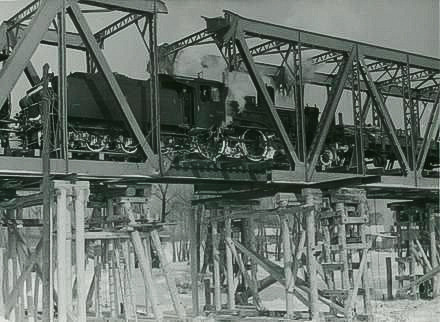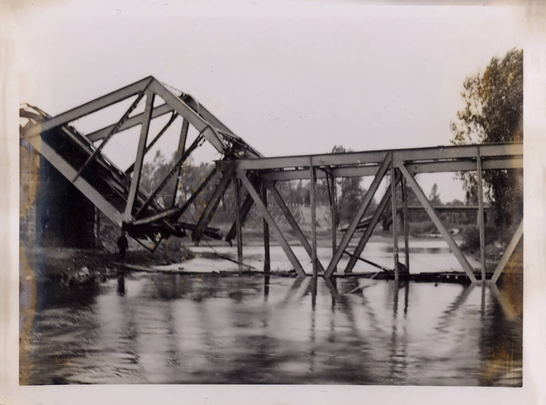 Z albumu Bronisława Prawdy. Naprawa zniszczonego we wrześniu 1939 r. mostu Kolejowego, na rzece Wkra w Pomiechówku.
