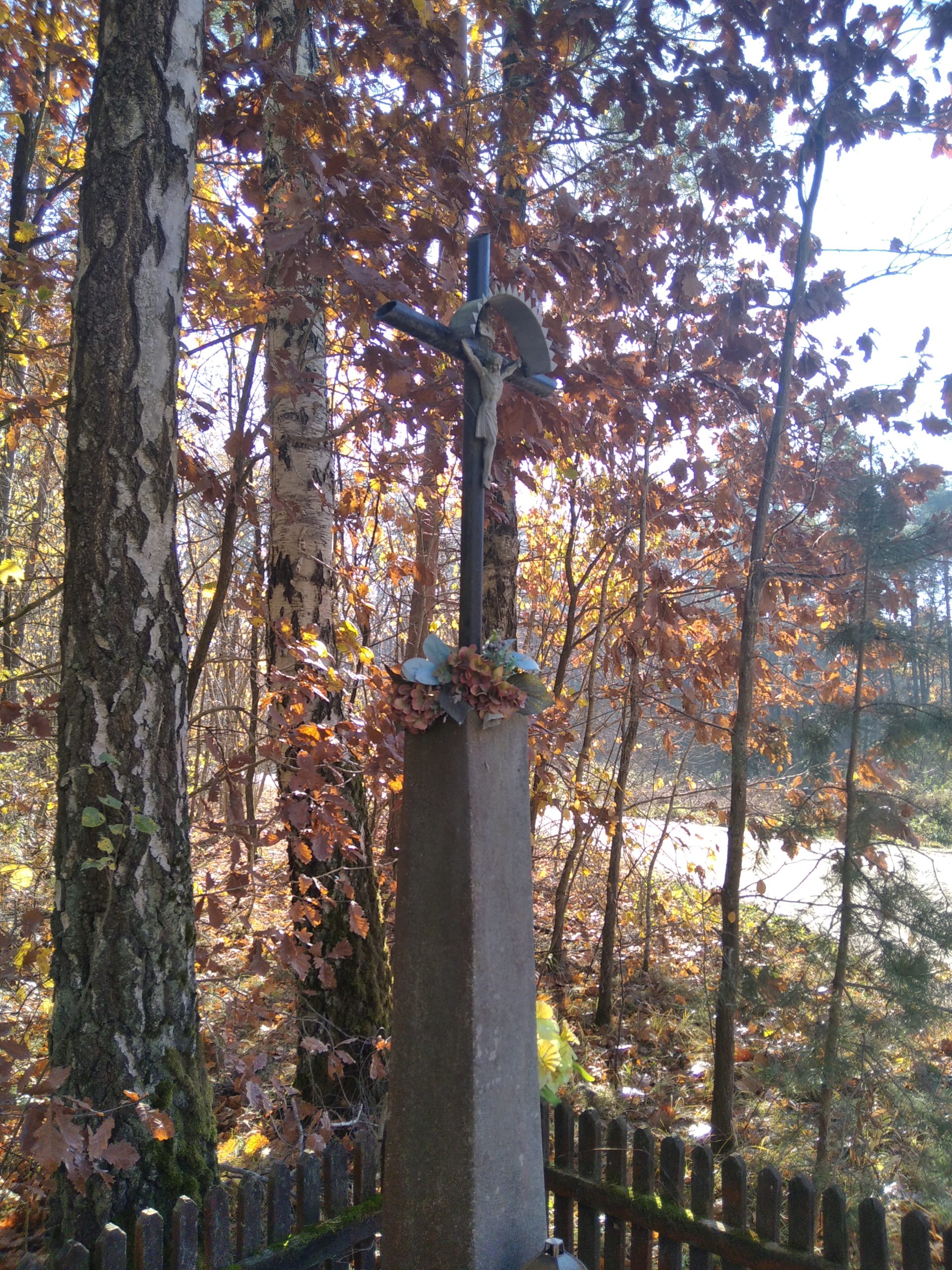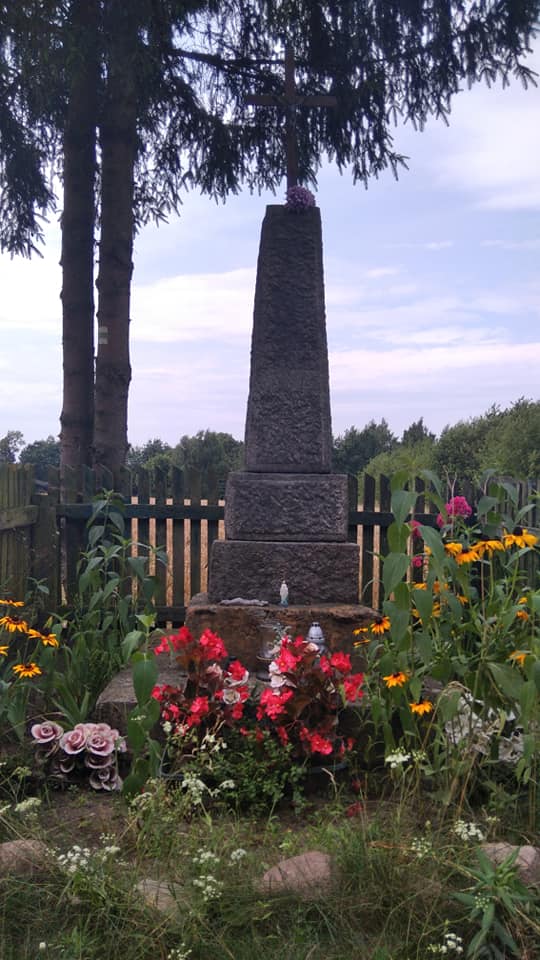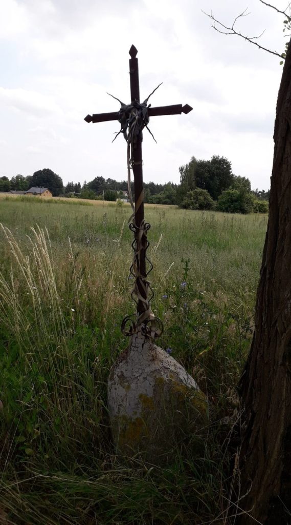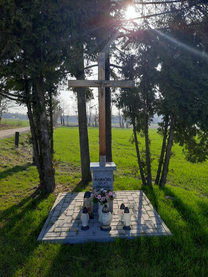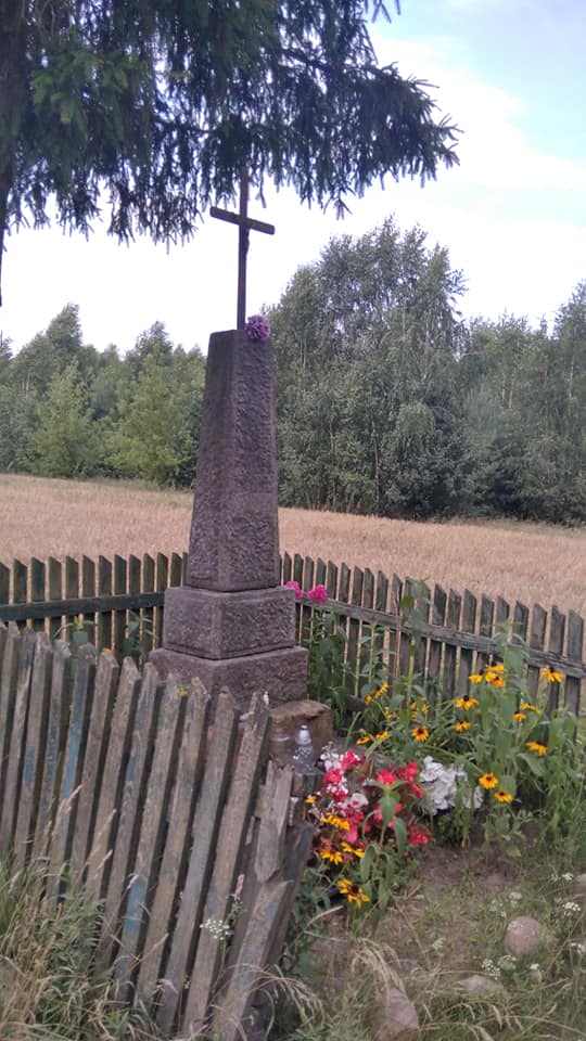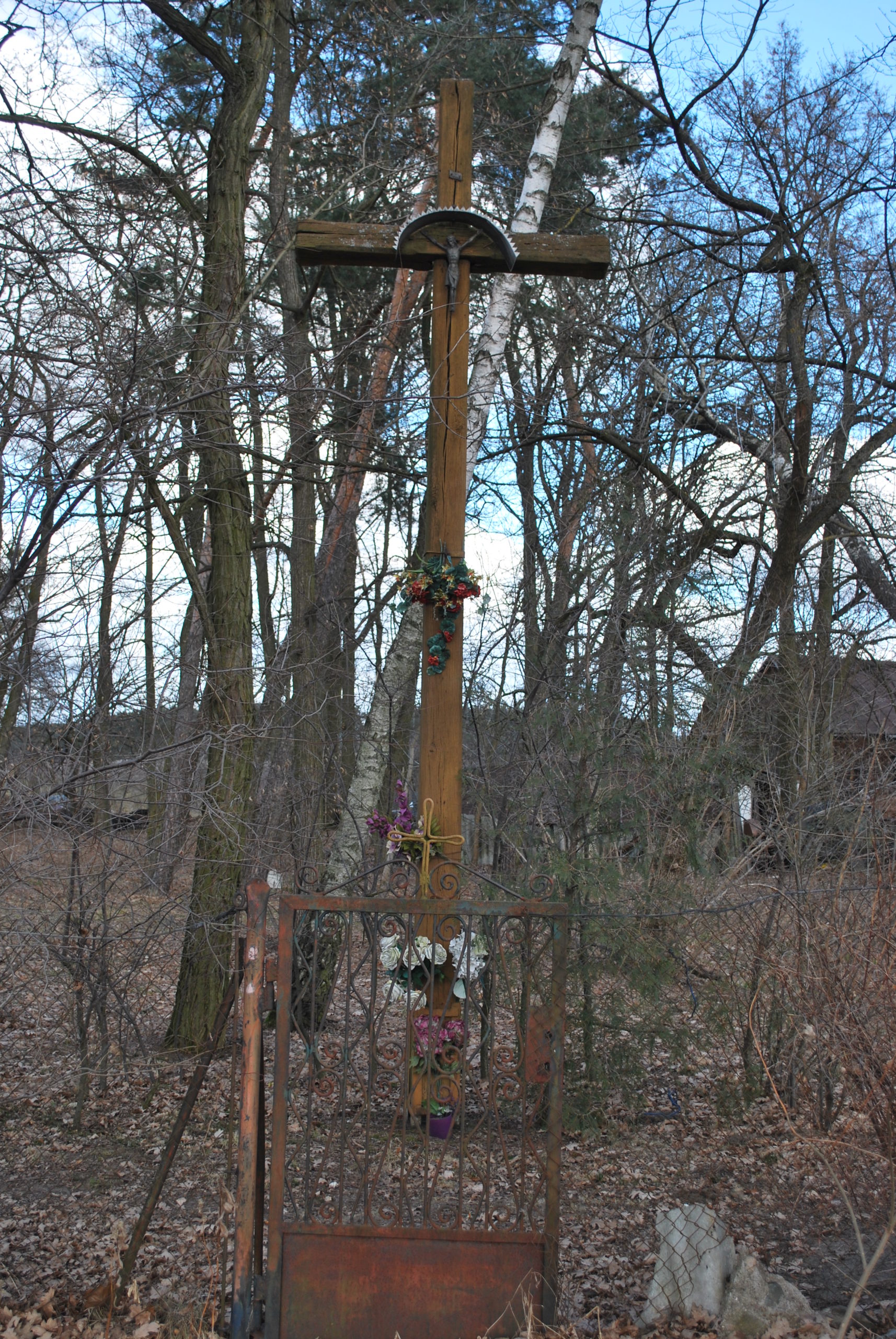 Joanna Kurpiewska: „Ten kamienny postument z metalowym krzyżem został przywieziony z cmentarza z grobu mojej prababci ok. 30 lat temu. Mój tata, Leonard Oleksiak, ustawił go na miejscu drewnianego krzyża (na poświęconej zapewne kiedyś ziemi) za zgodą ówczesnego właściciela najbliższej posesji. Na postumencie widać ślad po odkręconej tablicy nagrobnej, która przechowywana jest w naszej rodzinie do dziś. Widnieje na niej data śmierci prababci – 1907 r. Prawdopodobnie krzyż został wykonany właśnie w tym czasie.”