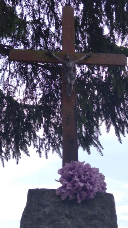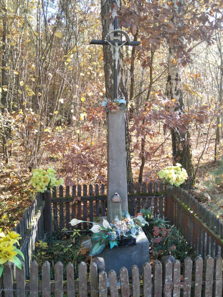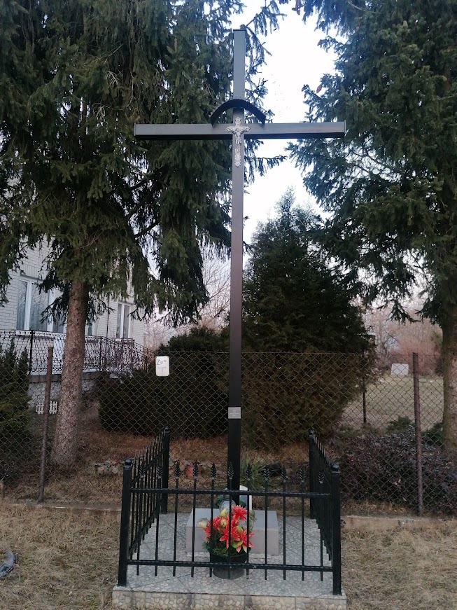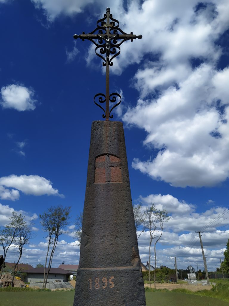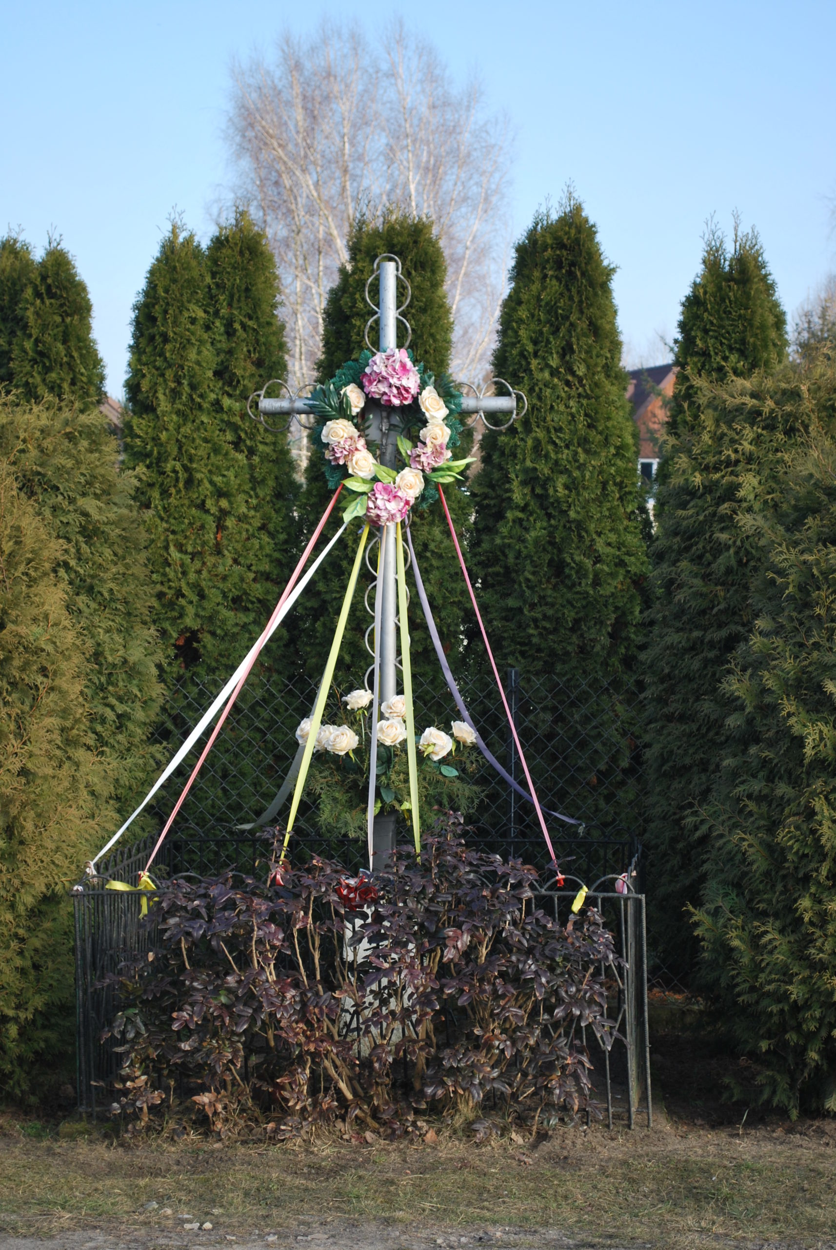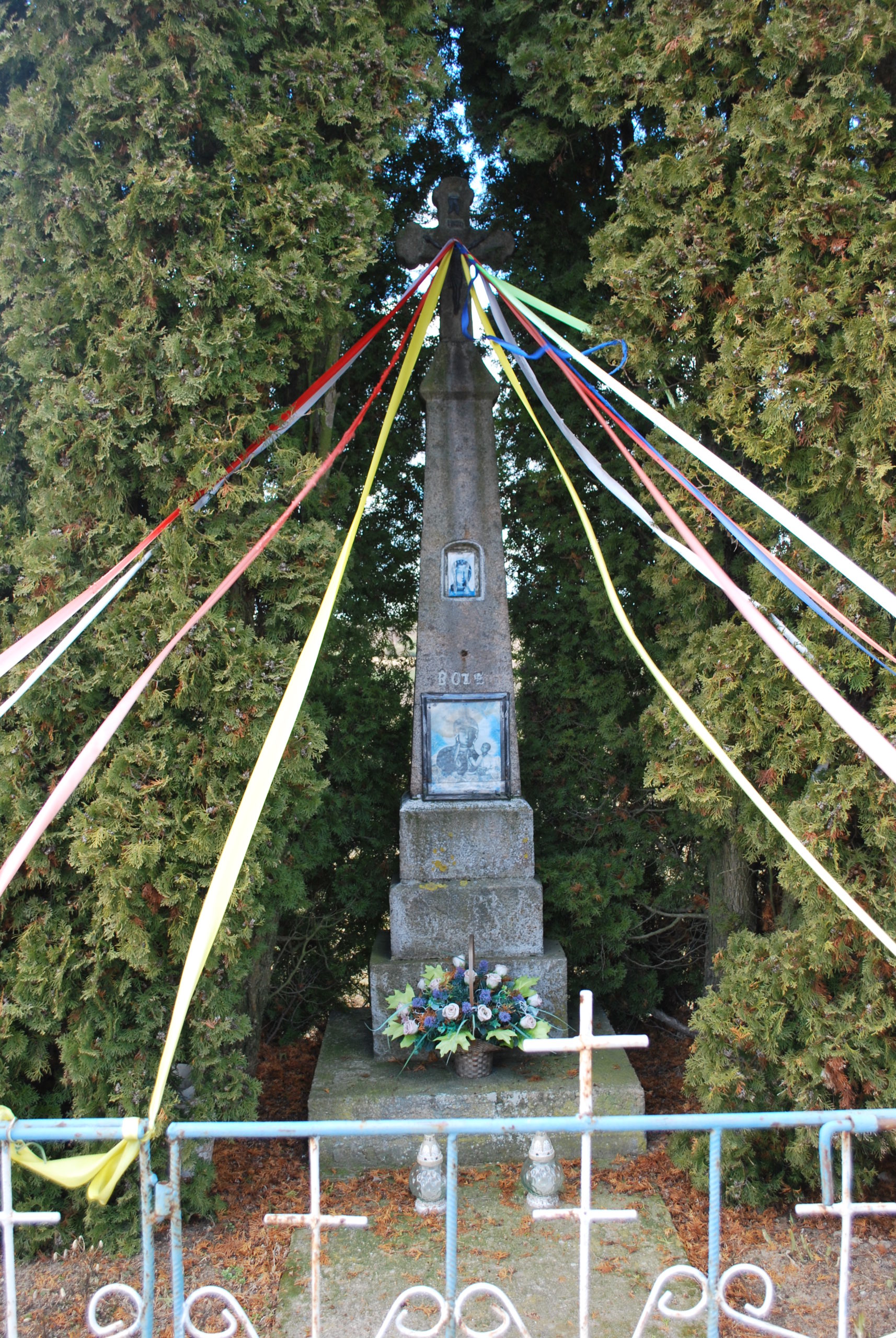 Joanna Kurpiewska: „Ten kamienny postument z metalowym krzyżem został przywieziony z cmentarza z grobu mojej prababci ok. 30 lat temu. Mój tata, Leonard Oleksiak, ustawił go na miejscu drewnianego krzyża (na poświęconej zapewne kiedyś ziemi) za zgodą ówczesnego właściciela najbliższej posesji. Na postumencie widać ślad po odkręconej tablicy nagrobnej, która przechowywana jest w naszej rodzinie do dziś. Widnieje na niej data śmierci prababci – 1907 r. Prawdopodobnie krzyż został wykonany właśnie w tym czasie.”