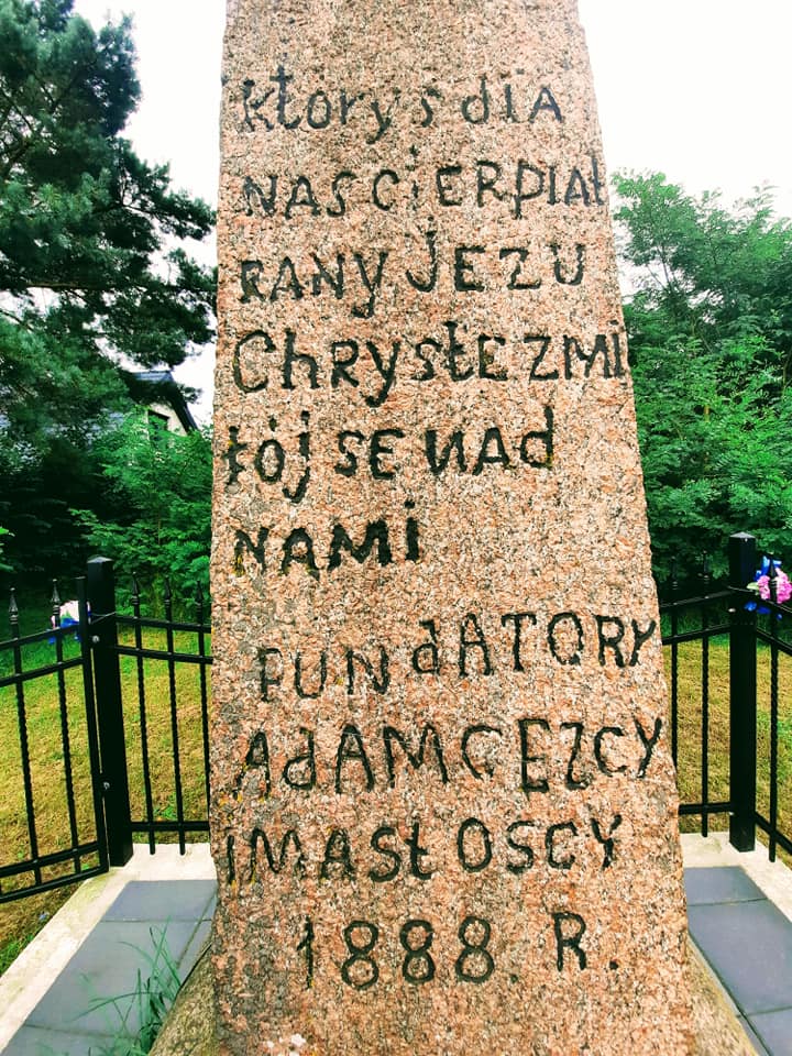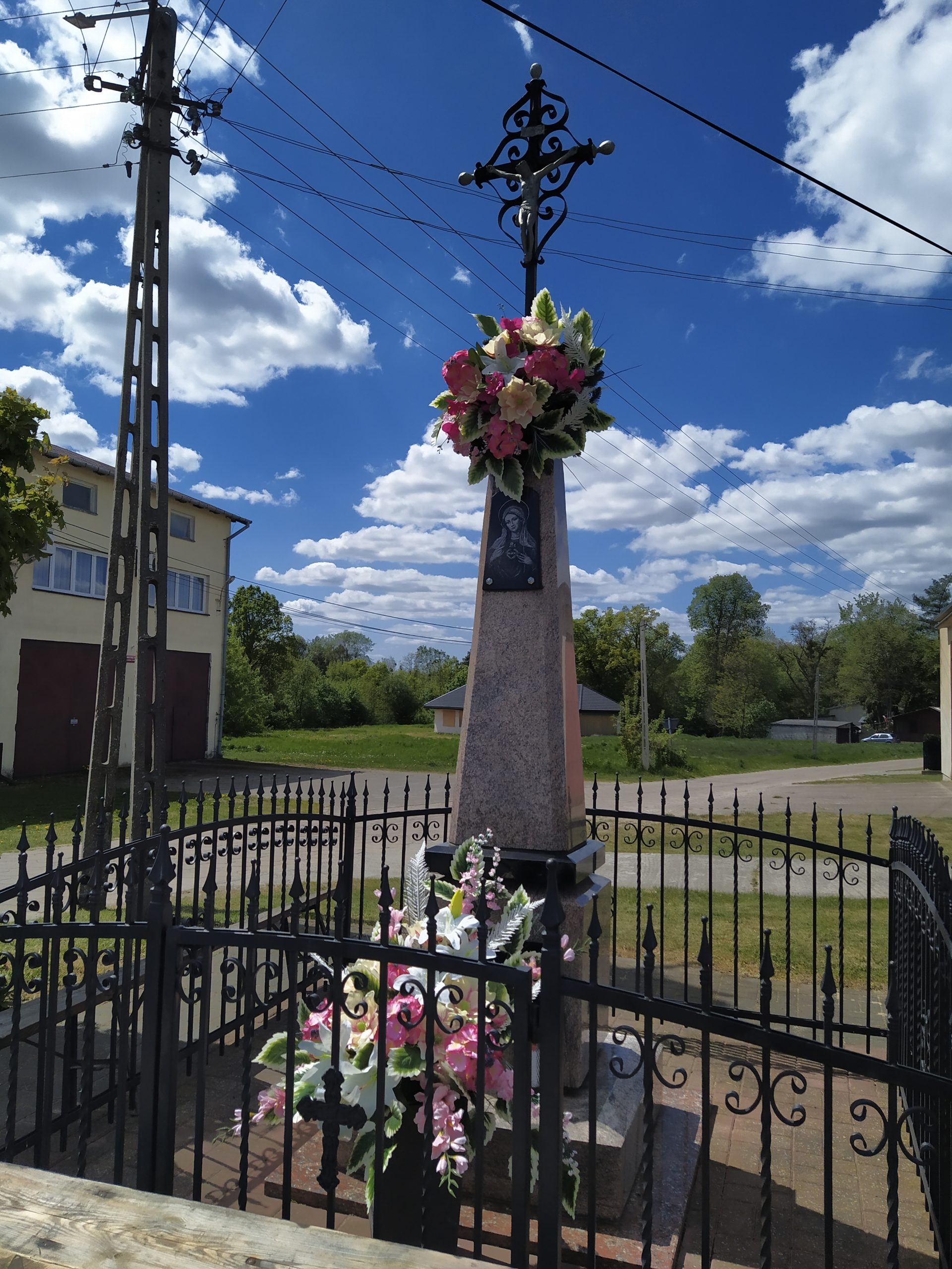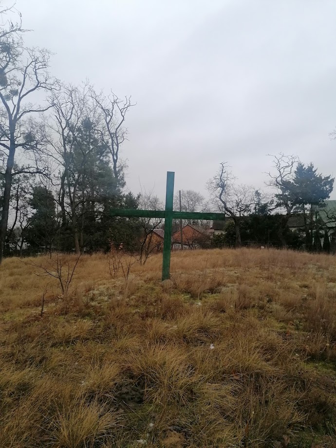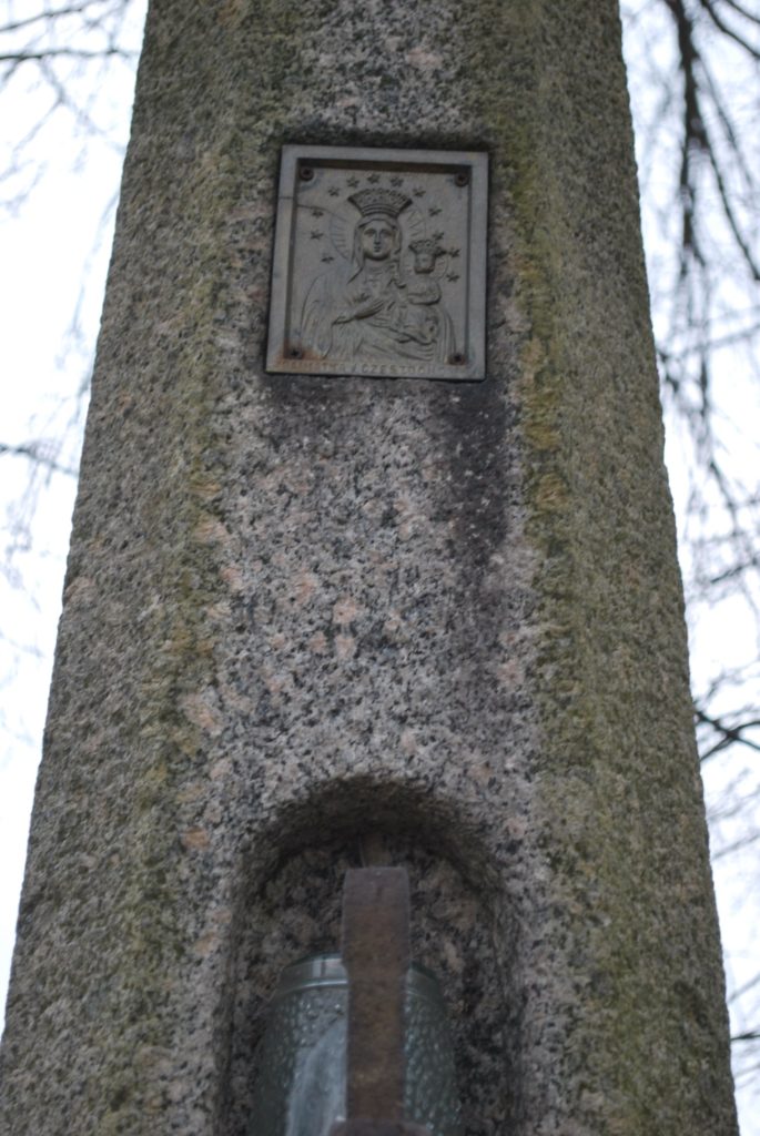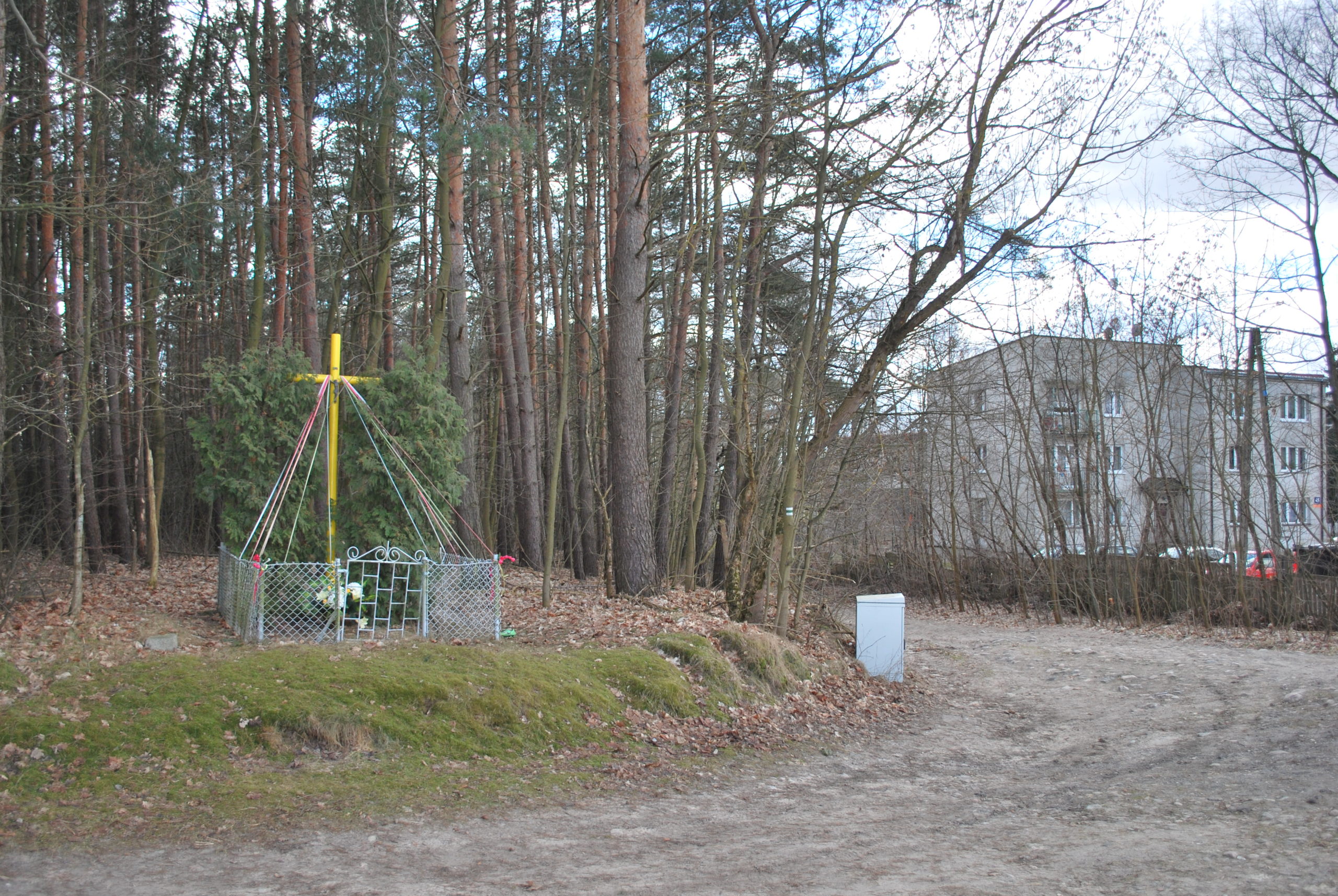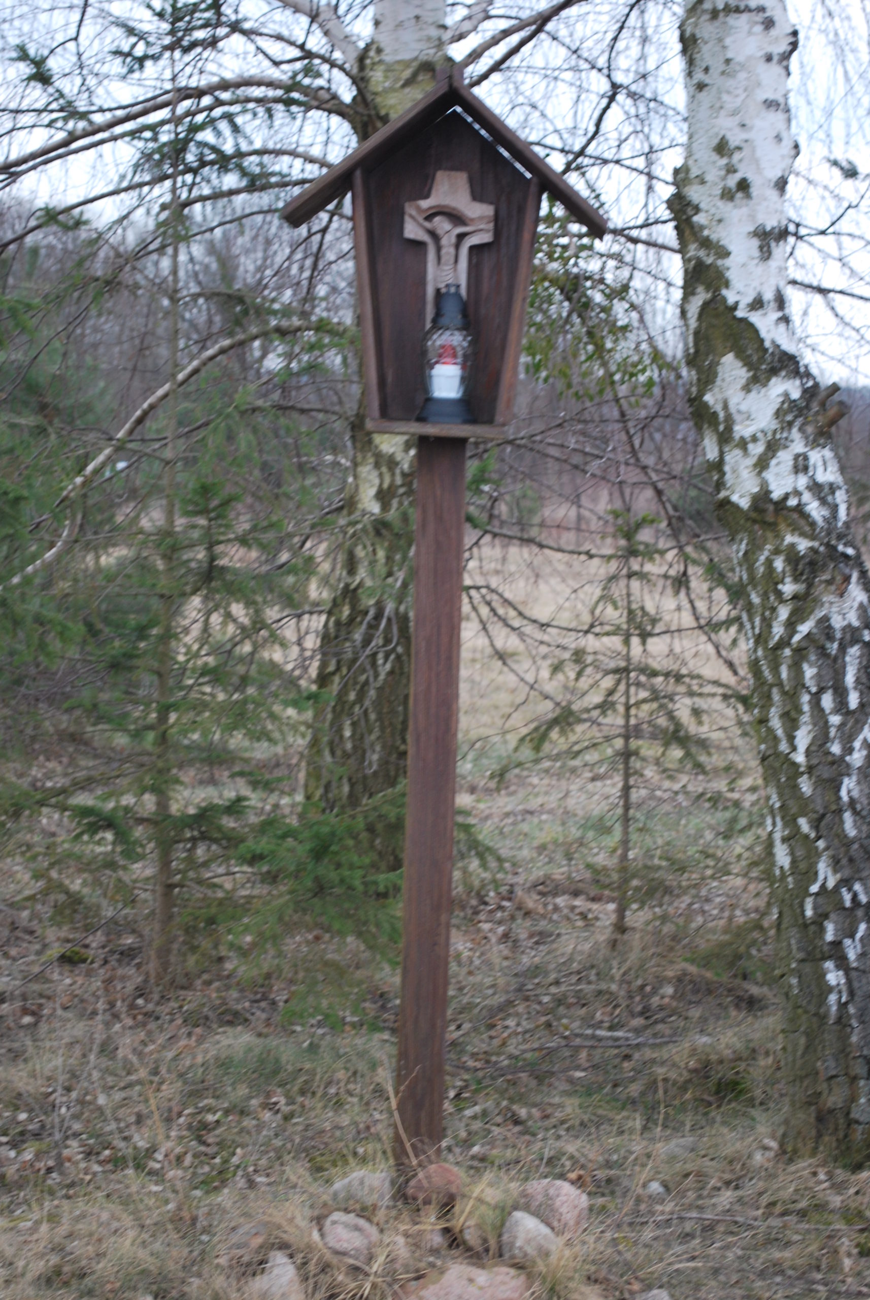 Joanna Kurpiewska: „Ten kamienny postument z metalowym krzyżem został przywieziony z cmentarza z grobu mojej prababci ok. 30 lat temu. Mój tata, Leonard Oleksiak, ustawił go na miejscu drewnianego krzyża (na poświęconej zapewne kiedyś ziemi) za zgodą ówczesnego właściciela najbliższej posesji. Na postumencie widać ślad po odkręconej tablicy nagrobnej, która przechowywana jest w naszej rodzinie do dziś. Widnieje na niej data śmierci prababci – 1907 r. Prawdopodobnie krzyż został wykonany właśnie w tym czasie.”