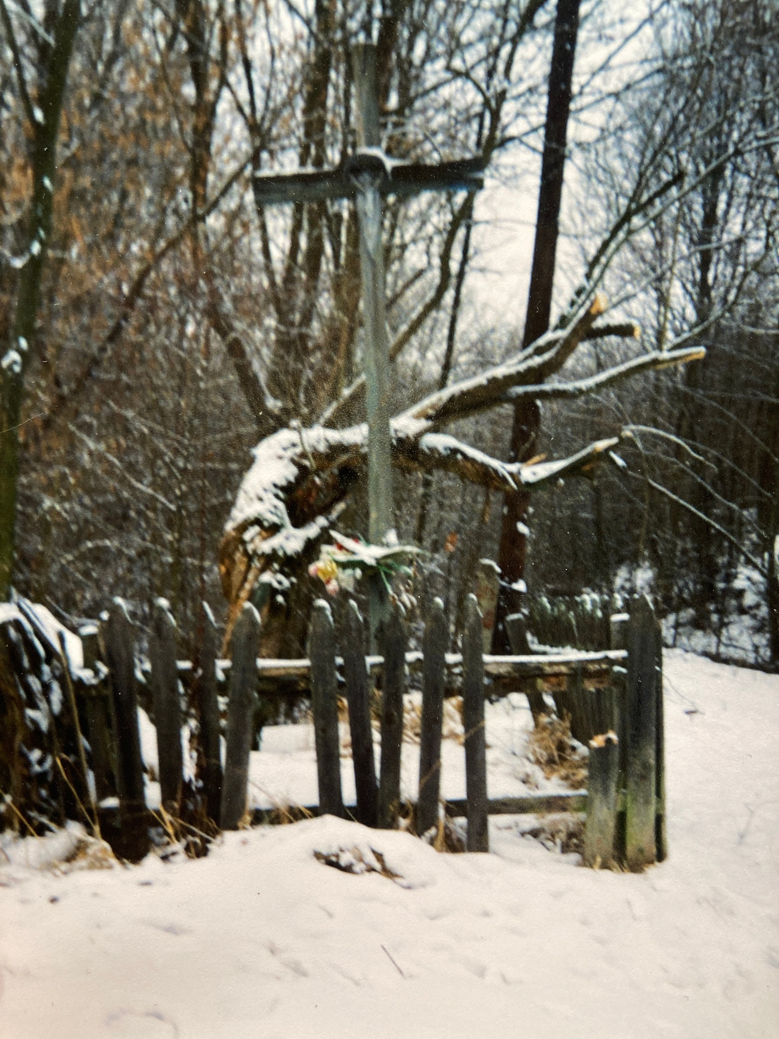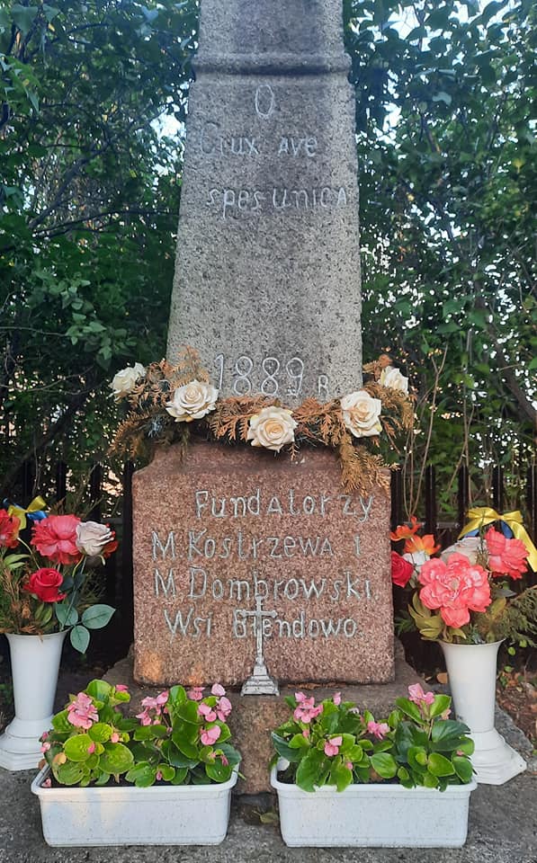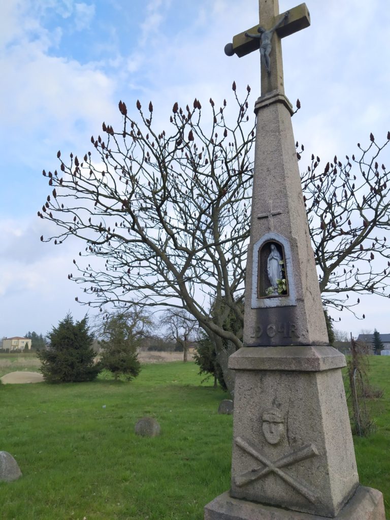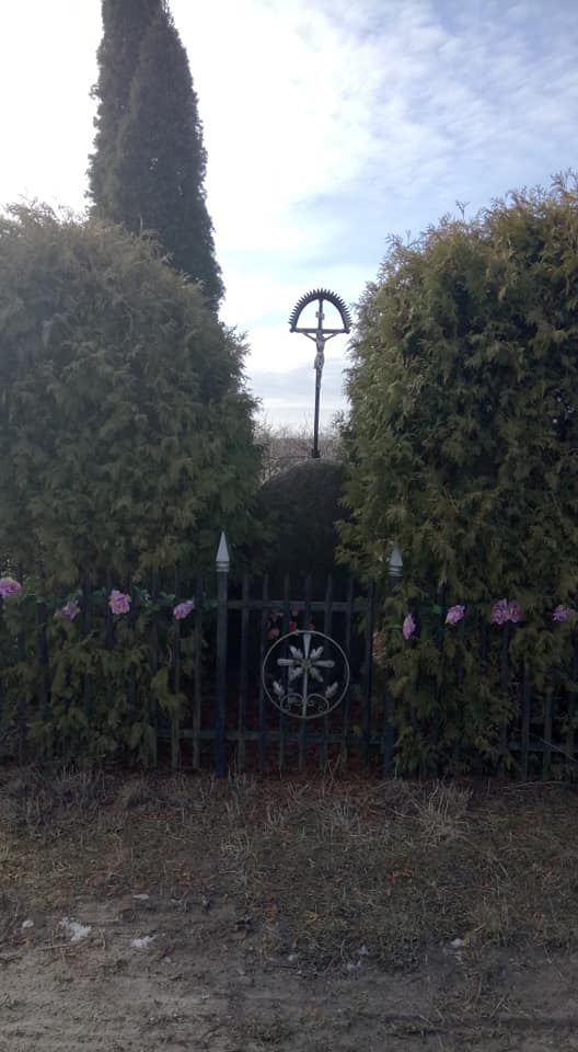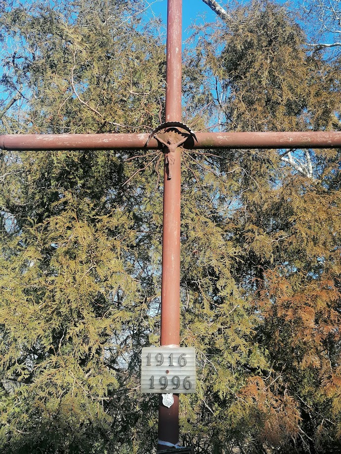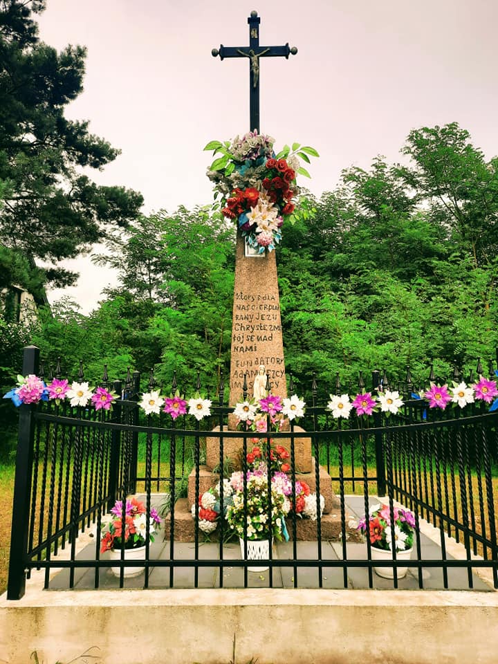 Joanna Kurpiewska: „Ten kamienny postument z metalowym krzyżem został przywieziony z cmentarza z grobu mojej prababci ok. 30 lat temu. Mój tata, Leonard Oleksiak, ustawił go na miejscu drewnianego krzyża (na poświęconej zapewne kiedyś ziemi) za zgodą ówczesnego właściciela najbliższej posesji. Na postumencie widać ślad po odkręconej tablicy nagrobnej, która przechowywana jest w naszej rodzinie do dziś. Widnieje na niej data śmierci prababci – 1907 r. Prawdopodobnie krzyż został wykonany właśnie w tym czasie.”