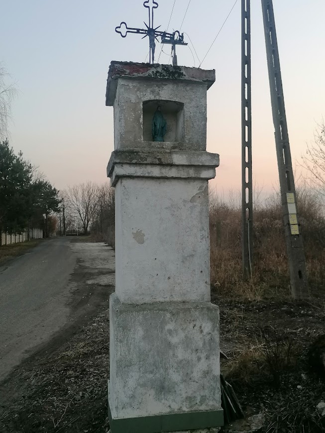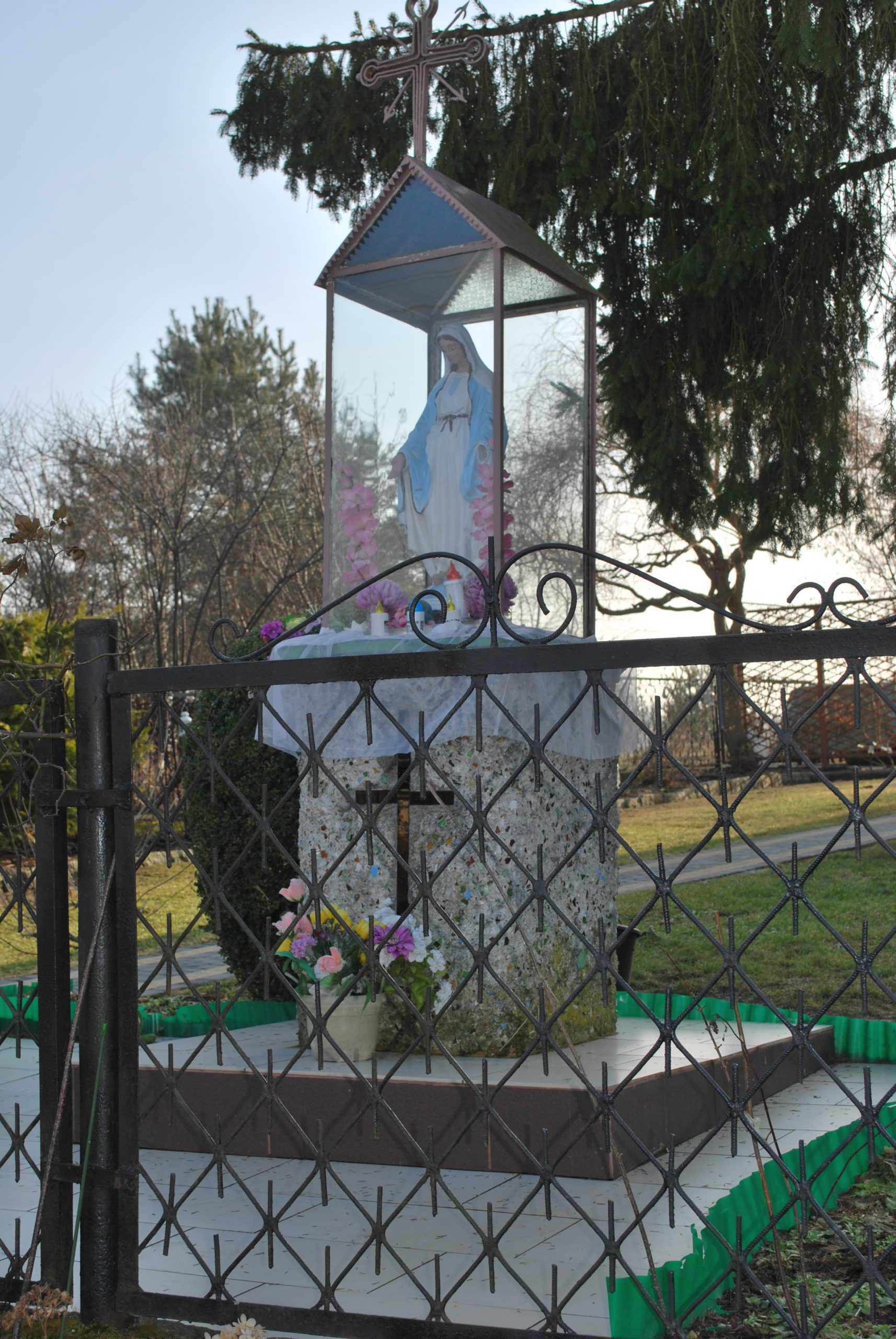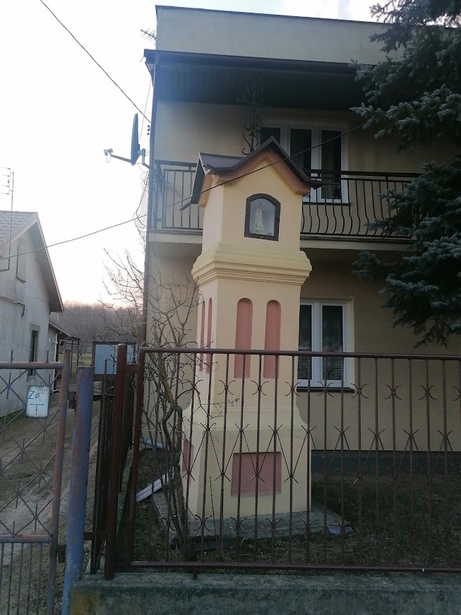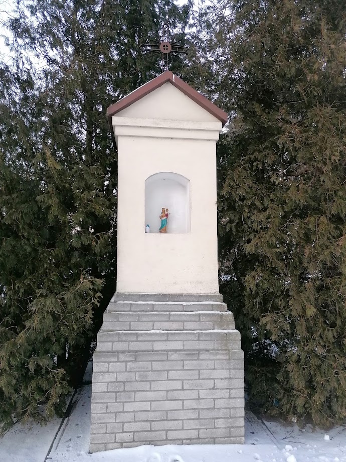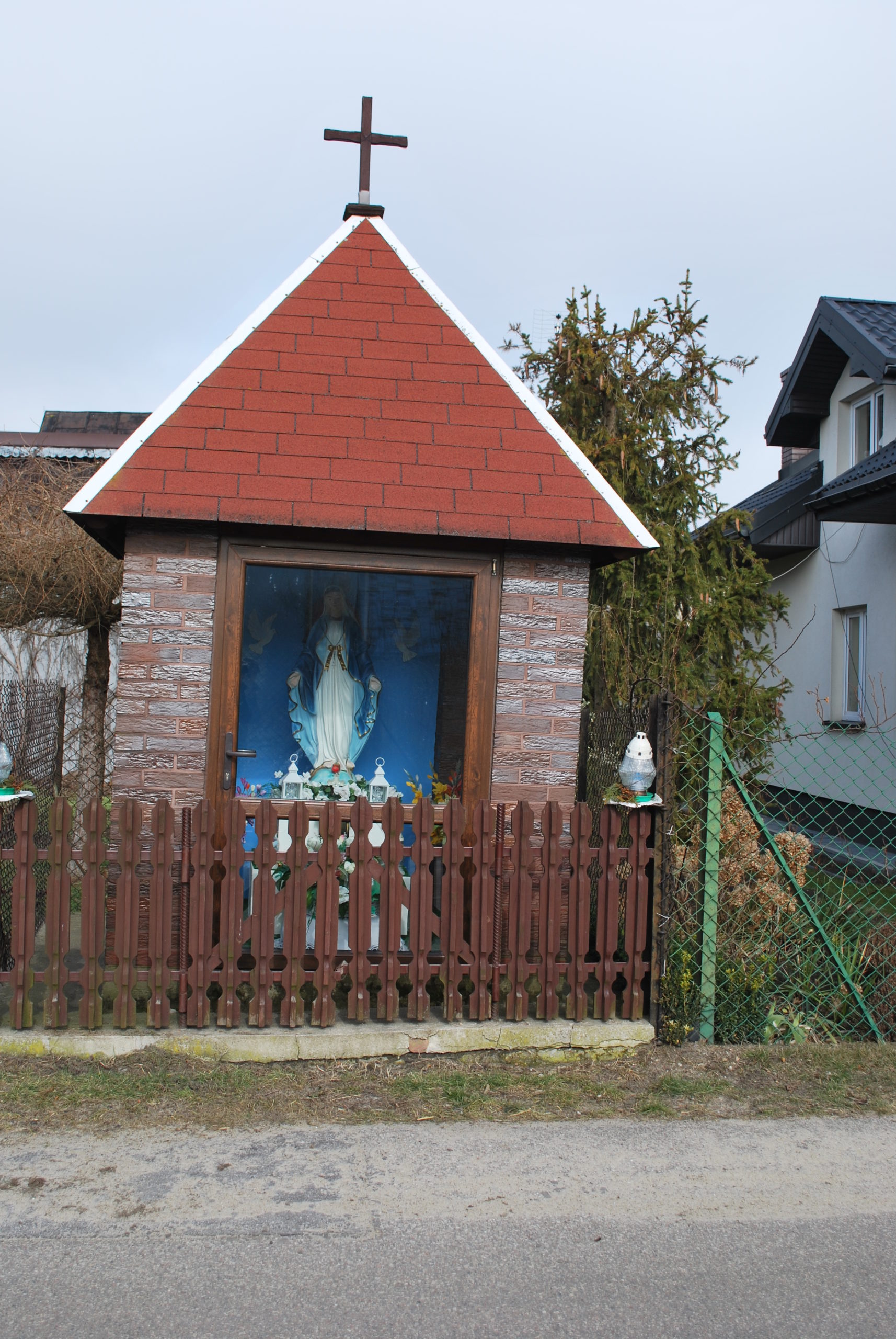 Kapliczka przy domu prywatnym, na ulicy Kwiatowej. Okazuje się, że choć wygląda świeżo, została zbudowana bardzo dawno. Tak wytłumaczył istnienie kapliczki obecny właściciel posesji: „Figura stoi od czasów kiedy działka po lewej stronie również należała do działki z figurą. Od tego miejsca zaczynało się pole moich praprapra… . A kończyło pod lasem widocznym z drogi 62 koło fortu lll . Nie było wtedy kolei. Nie było fortu. A kapliczkę tak jak i inne budowano zawsze w jednym celu . Stawiano na początku i powierzano ziemię, dobytek Panu Bogu aby chronił przed złem.”
