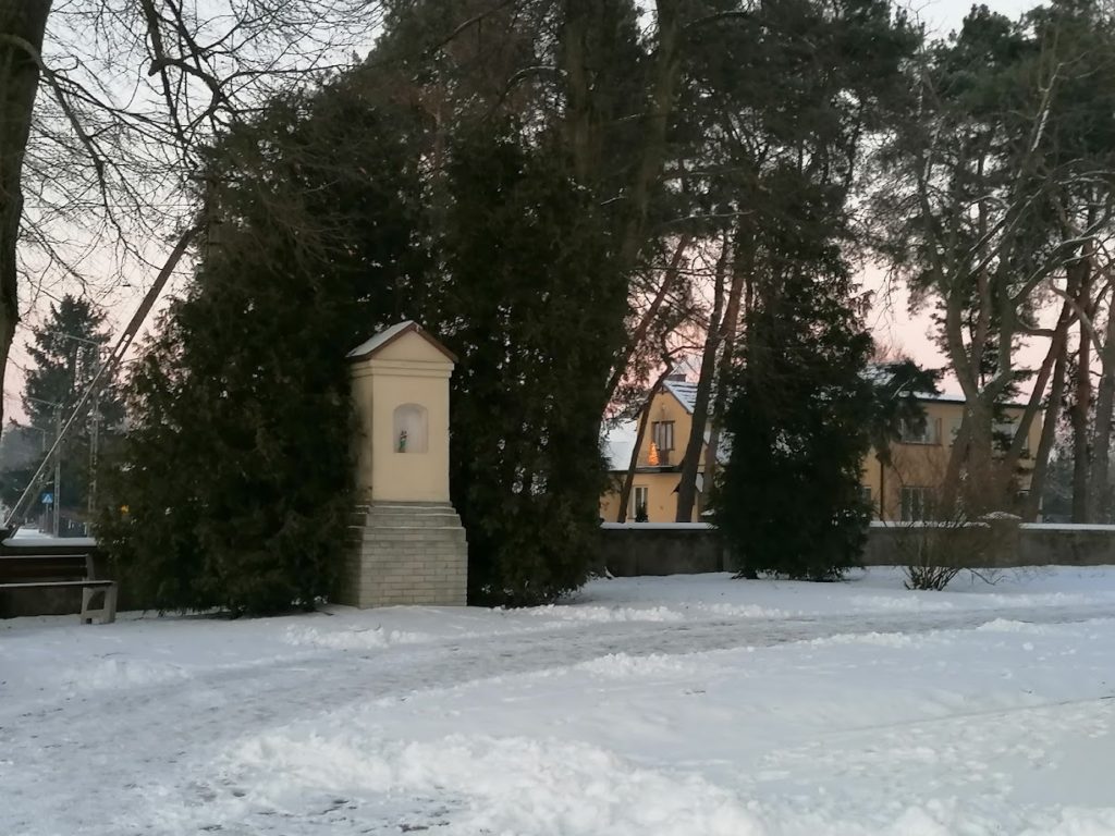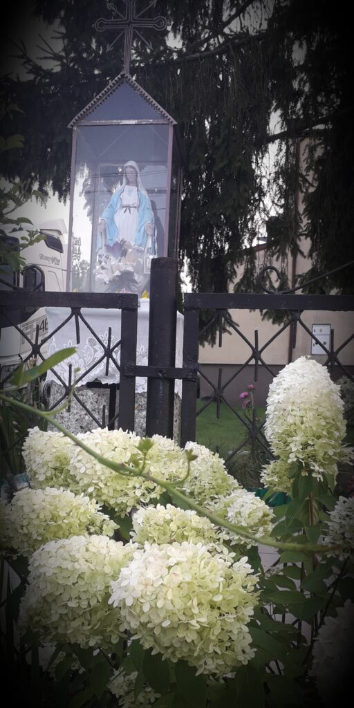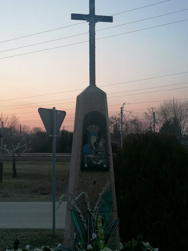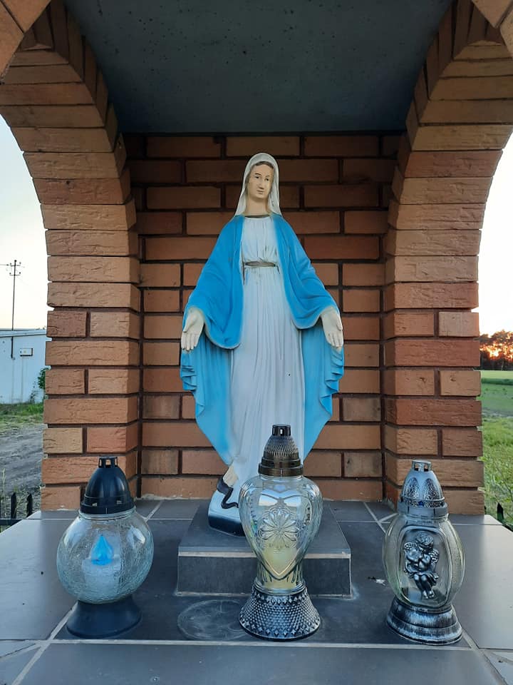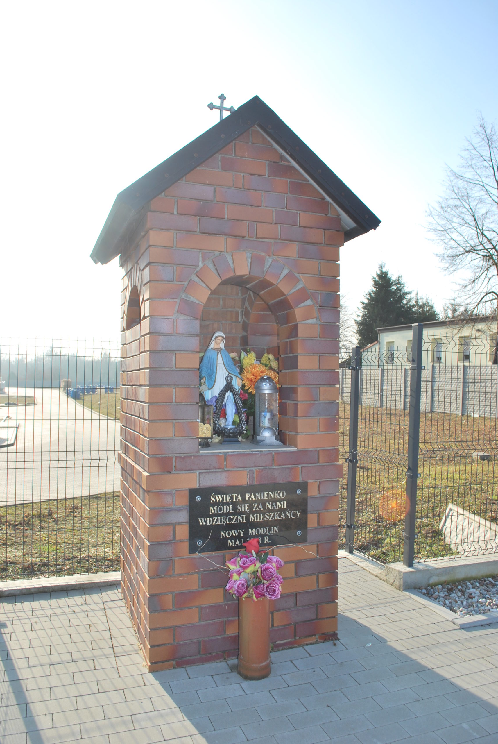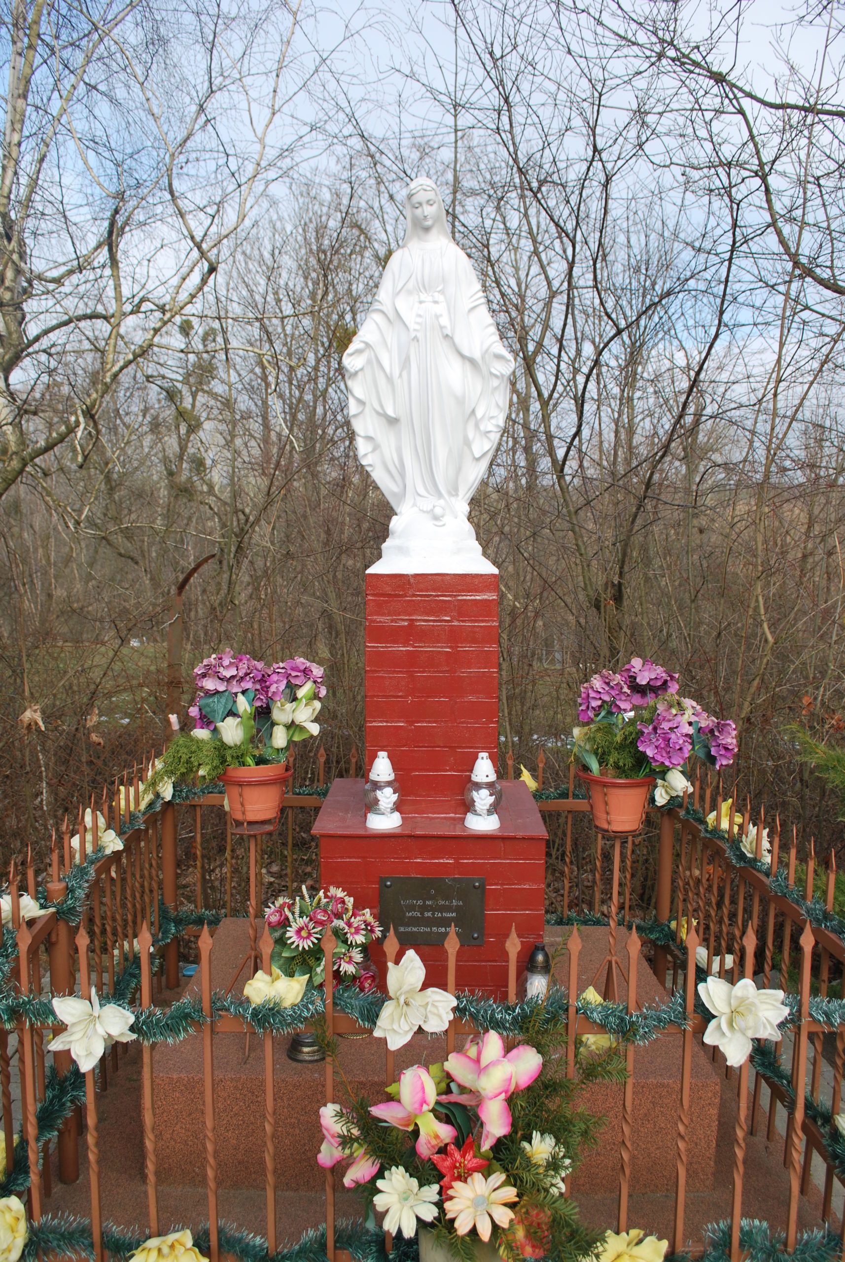 Kapliczka przy domu prywatnym, na ulicy Kwiatowej. Okazuje się, że choć wygląda świeżo, została zbudowana bardzo dawno. Tak wytłumaczył istnienie kapliczki obecny właściciel posesji: „Figura stoi od czasów kiedy działka po lewej stronie również należała do działki z figurą. Od tego miejsca zaczynało się pole moich praprapra… . A kończyło pod lasem widocznym z drogi 62 koło fortu lll . Nie było wtedy kolei. Nie było fortu. A kapliczkę tak jak i inne budowano zawsze w jednym celu . Stawiano na początku i powierzano ziemię, dobytek Panu Bogu aby chronił przed złem.”