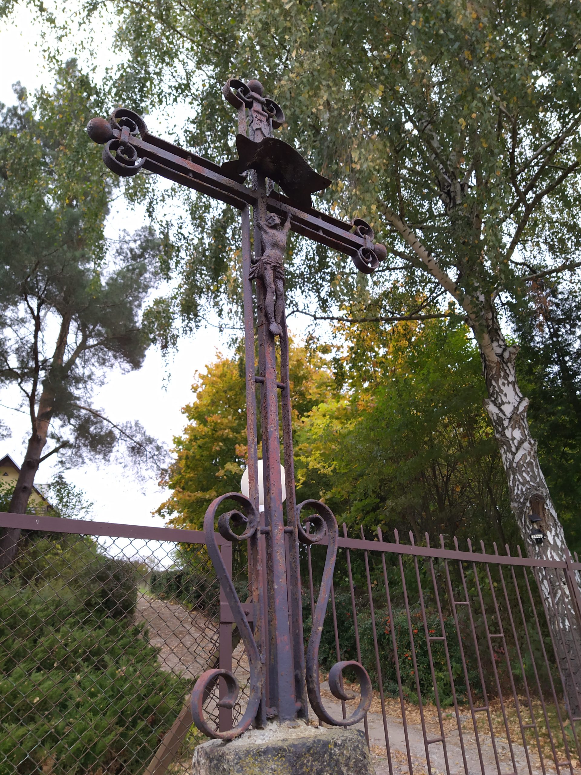 Krzyż osadzany jest w kamieniu, a kamień – mocno popękany. Ktoś próbował skleić cementem. Na wspomnianej posesji (we wsi) znajduje się też kamienna kapliczka.