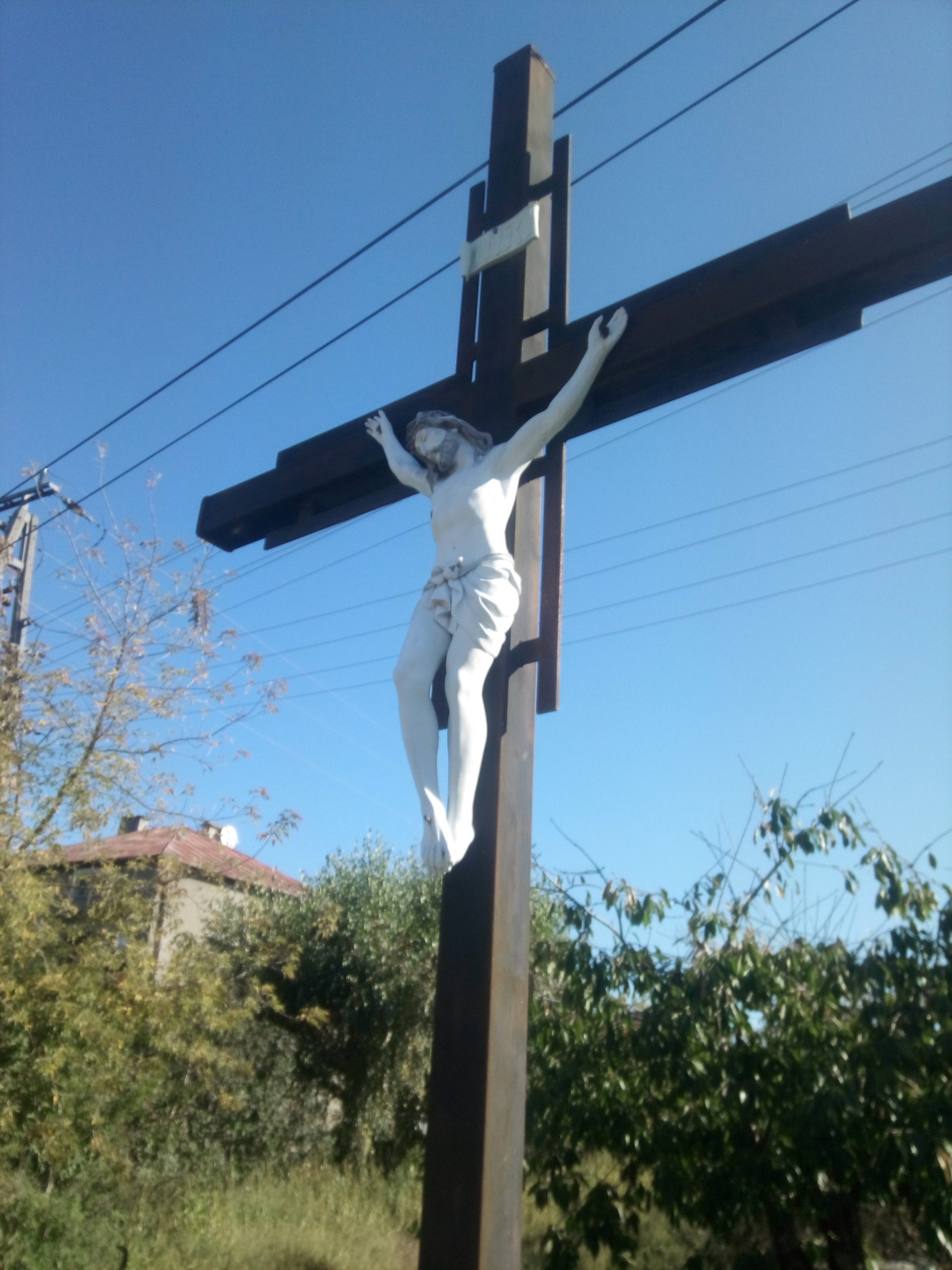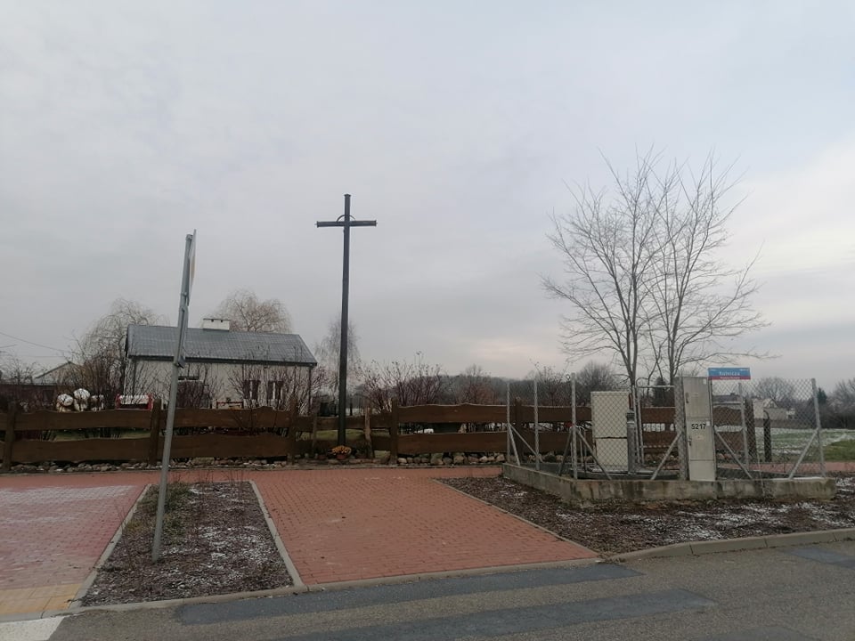 Krzyż znajduje się w pobliżu szkoły i drogi E62.