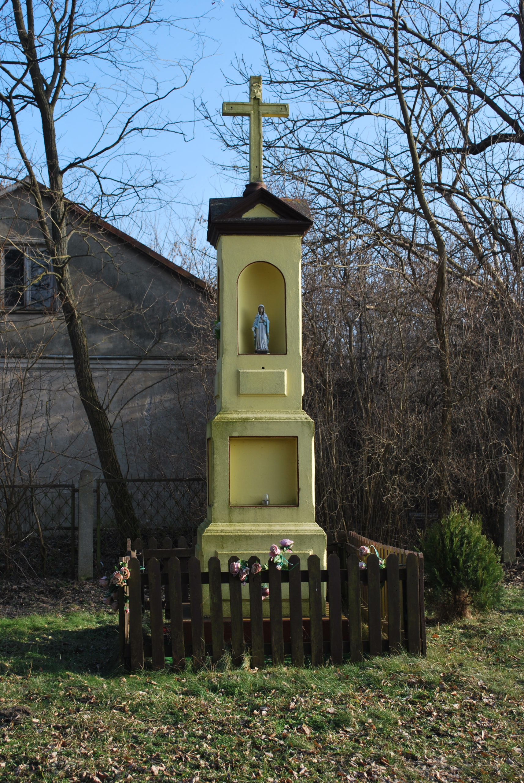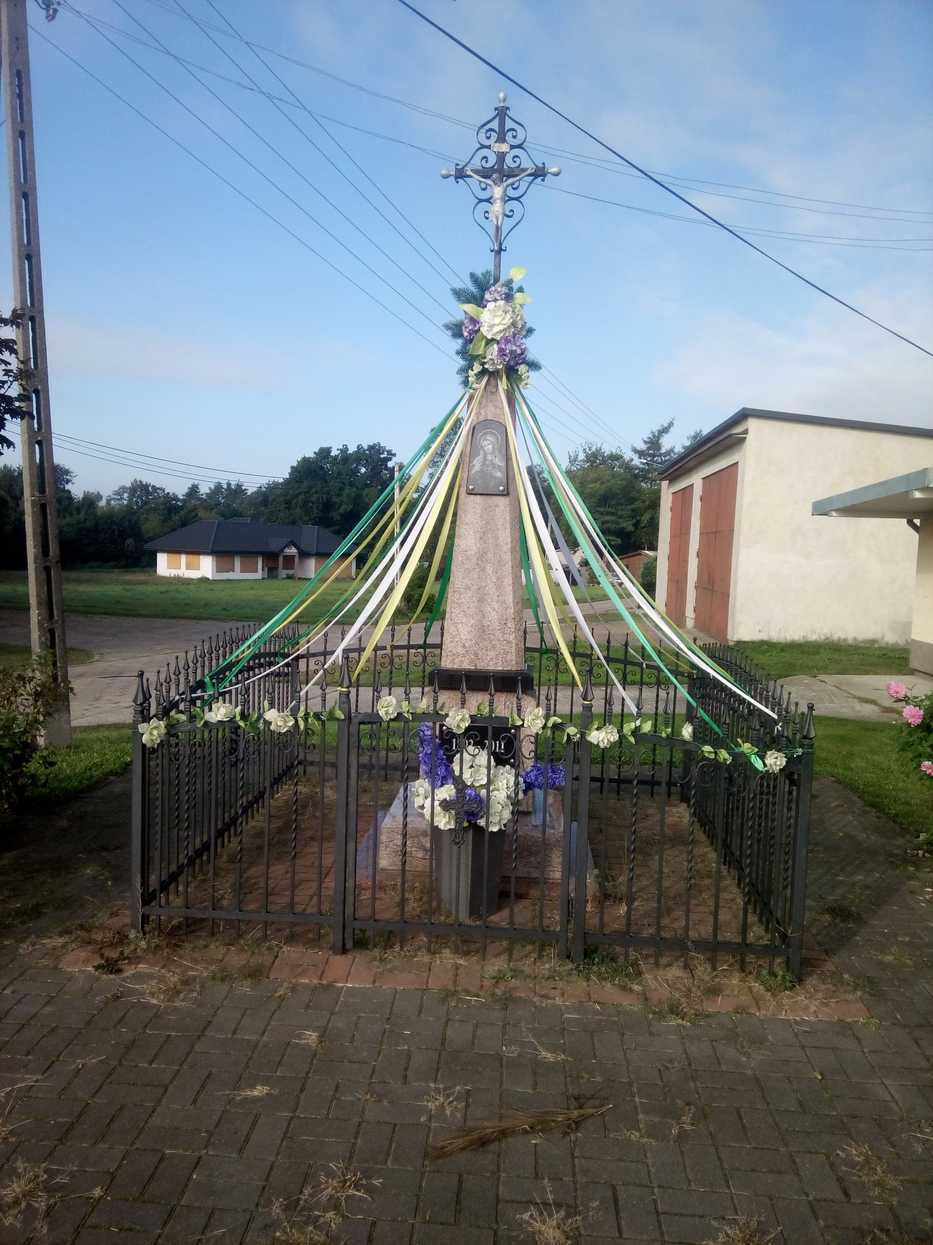 Z opowieści i pamięci mieszkańców wynika, że jest to obiekt wotywny ufundowany, by uczcić zakończenie epidemii (być może grypy hiszpanki z 1918 roku). Początkowo stał tu krzyż drewniany, który został wymieniony na obecny obiekt metalowo-kamienny w latach 80. lub 90. Jest to właściwie dawny nagrobek, który wcześniej stał na grobie rodzinnym i został ofiarowany przez jednego z mieszkańców, by utrzymać ciągłość kapliczki.