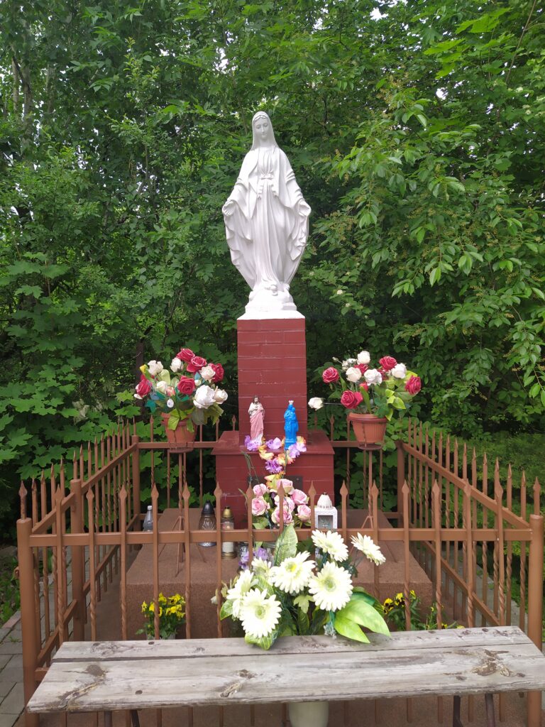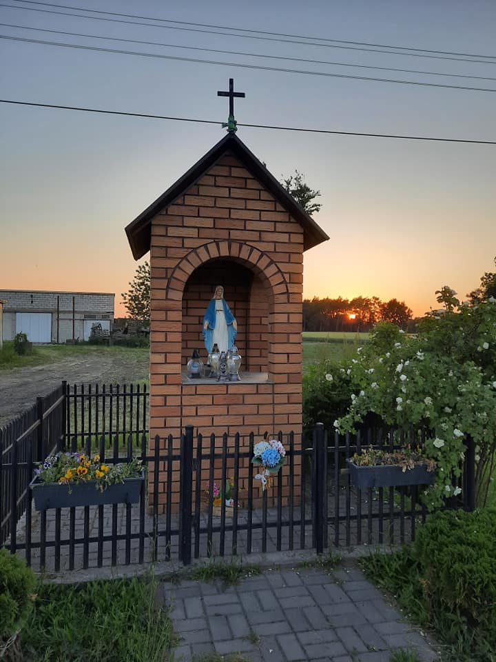 Kapliczka sięga czasów przedwojennych, kiedy znajdowała się na działce państwa Ostrołęccy, którzy ją wybudowali. Figurka za czasów wojny i później była kaplicą z cegły, a w środku, w małym otworze znajdowała się figurka Matki Bożej. Kiedy działkę zakupili państwo Bieżuńscy, kapliczka była już zniszczona, zatem nowi właściciele przebudowali ją i zakupili dużą figurkę. Obecnie dba o Nią pani Teresa Bieżuńska, obecna właścicielka posesji