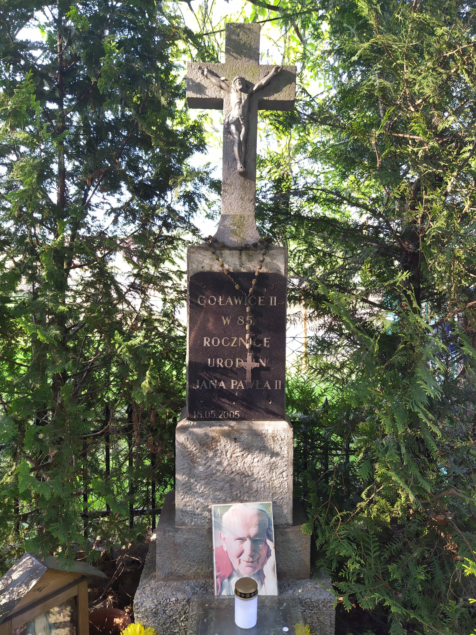 „W Goławicach Drugich w centrum wsi znajduje się figurka. Dawniej był to drewniany krzyż, obecnie jest murowana, jak na zdjęciu poniżej. Początkowo na kamiennej tablicy widniał napis „Pamiątka mieszkańców Jerozolimki”. Obecna, powstała 18.05.2005r., w 85 rocznicę urodzin Jana Pawła II.”