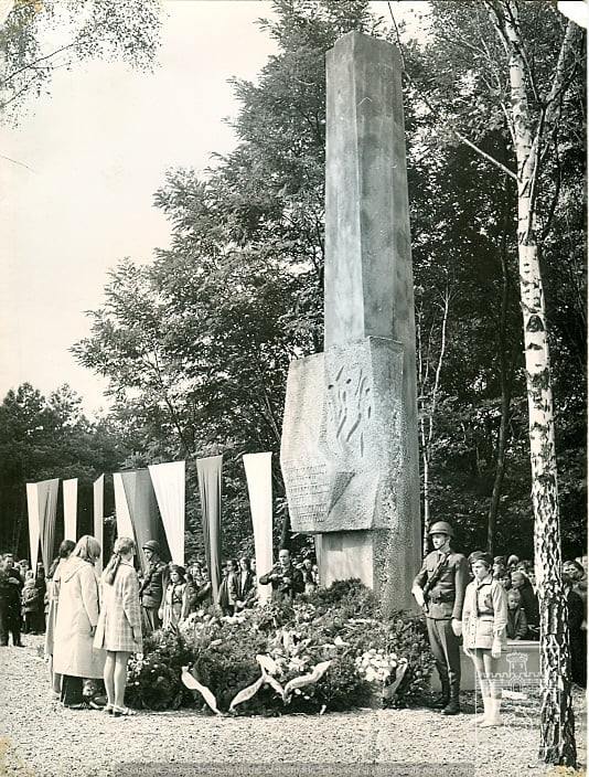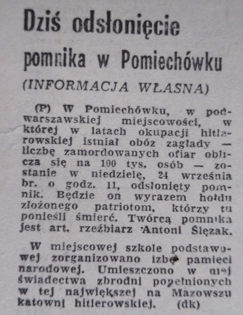 Pomnik znajduje się w Pomiechówku przy ulicy Nasielskiej przed Szkołą Podstawową. 24 września 1974 roku odbyła się uroczystość odsłonięcia pomnika, projekt wykonał artysta rzeźbiarz Antoni Ślęzak. Pomnik upamiętnia ofiary obozu hitlerowskiego w Forcie III oraz wszystkie ofiary II wojny światowej. Pomnik powstał po sesji naukowej „Pomiechówek oskarża”, która odbyła się w maju 1972 roku. Wtedy został zamurowany kamień węgielny pod pomnik, który rzekomo jest kamieniem pochodzącym z Fortu III. W 2020 roku Fundacja Fort III Pomiechówek dokonała rewitalizacji pomnika. Prace wykonała firma Granity Skwara – kamień naturalny. Koszty okazały się dużo większe niż wcześniej przewidziany budżet, ale firma poniosła te dodatkowe koszty bezinteresownie. Fundacja Fort III Pomiechówek, stara się o przywrócenie terenowi wokół pomnika, pierwotnego wyglądu, który widoczny jest na jednym ze zdjęć. Na zdjęciu również jedna z korespondencji w tej sprawie z Lasami Państwowymi.