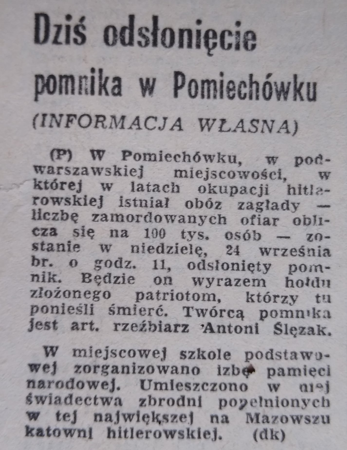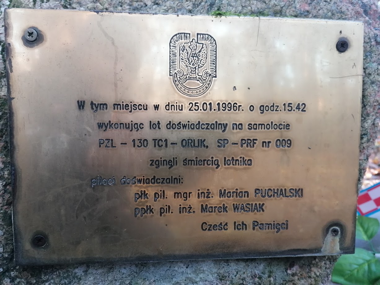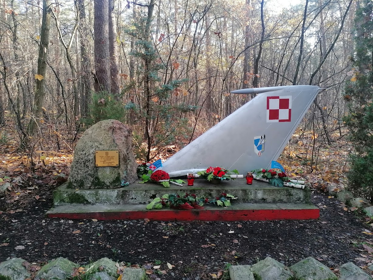 25 stycznia 1996 roku, w lesie w pobliżu Leśnictwa Pomiechówek, miała miejsce katastrofa lotnicza, w której zginęło dwóch pilotów oblatywaczy: płk Marian Puchalski i ppłk Marek Wasiak. W miejscu katastrofy znajduje się pomnik, na który składa się kamień z tablicą i ogon samolotu. Szczegóły katastrofy zostały opisane na tablicy (zdjęcie poniżej).