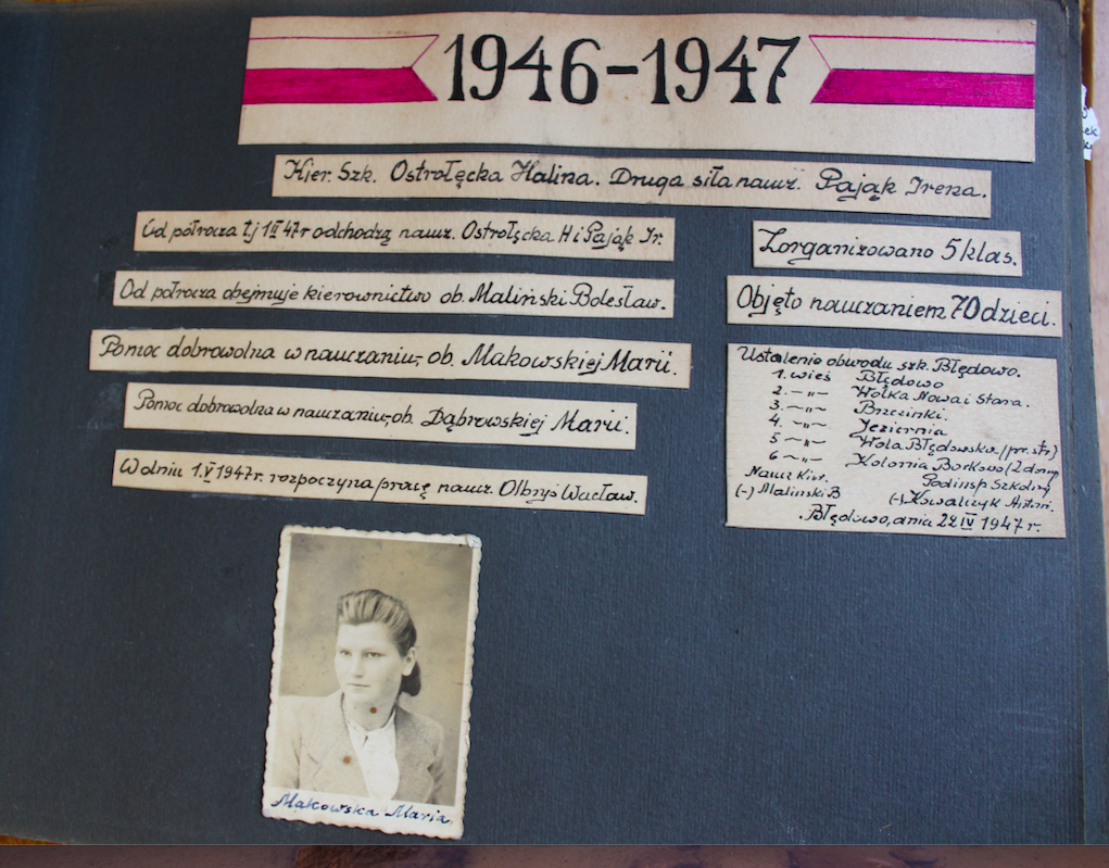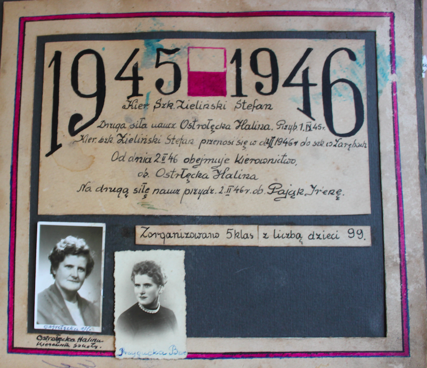 Od 1 IX 1945 roku nauczycielką zostaje p. Halina Ostrołęcka, która od lutego 1946 roku pełni funkcję kierowniczki szkoły, po odejściu Stefana Zielińskiego do szkoły we wsi Zareby, od 2 lutego 1946 przydział do pracy dostaje Irena Pająk.