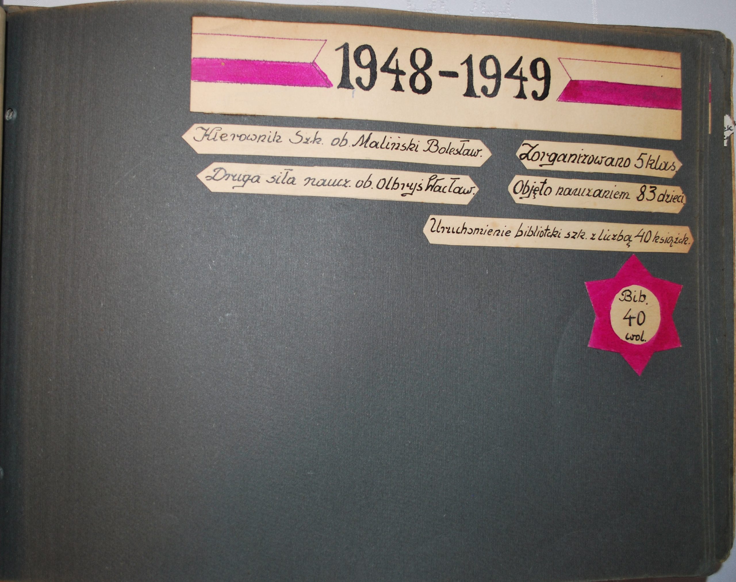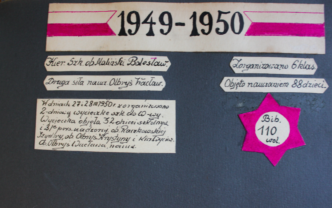 W roku szkolnym 1949-1950 kierownikiem szkoły jest p. Bolesław Maliński, nauczycielem Wacław Olbryś.