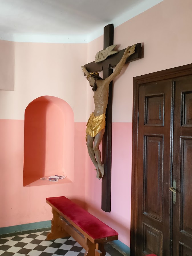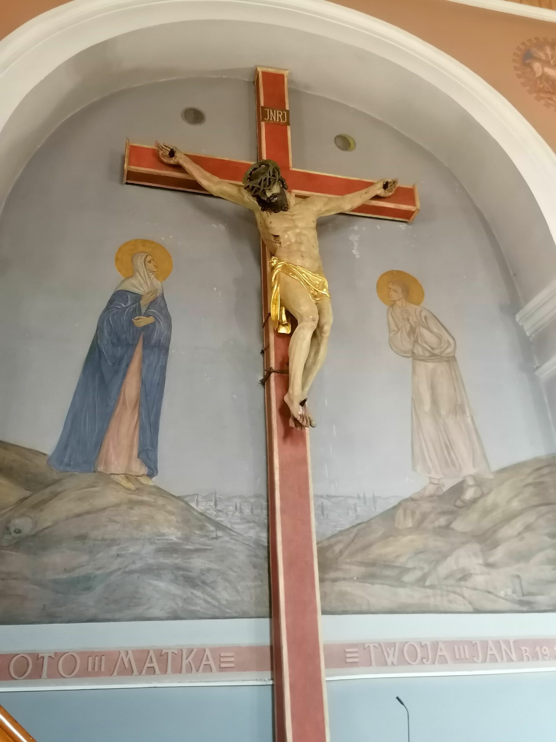 - krucyfiks datowany na pierwszą połowę XVII wieku, krzyż malowany był na biało, na kolor orzechowy, obecnie na początku XXI wieku został odrestaurowany i przywrócono mu pierwotne barwy.