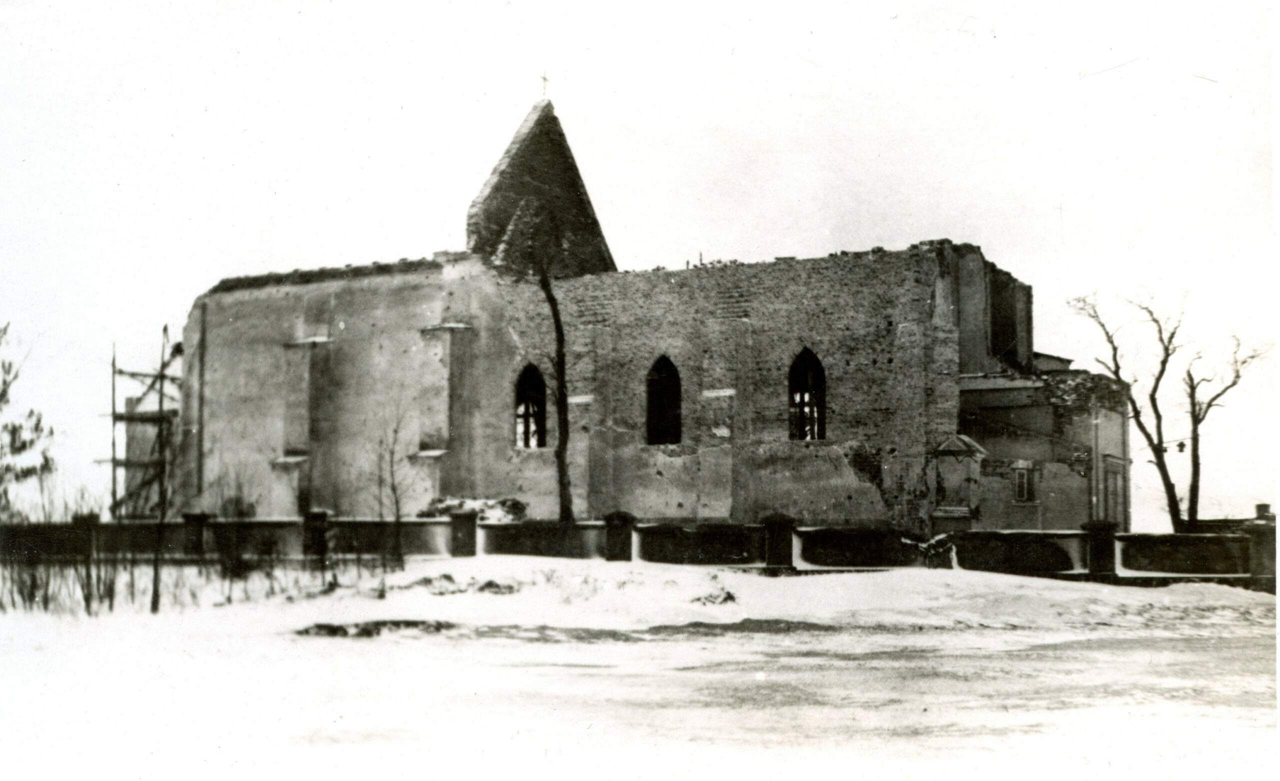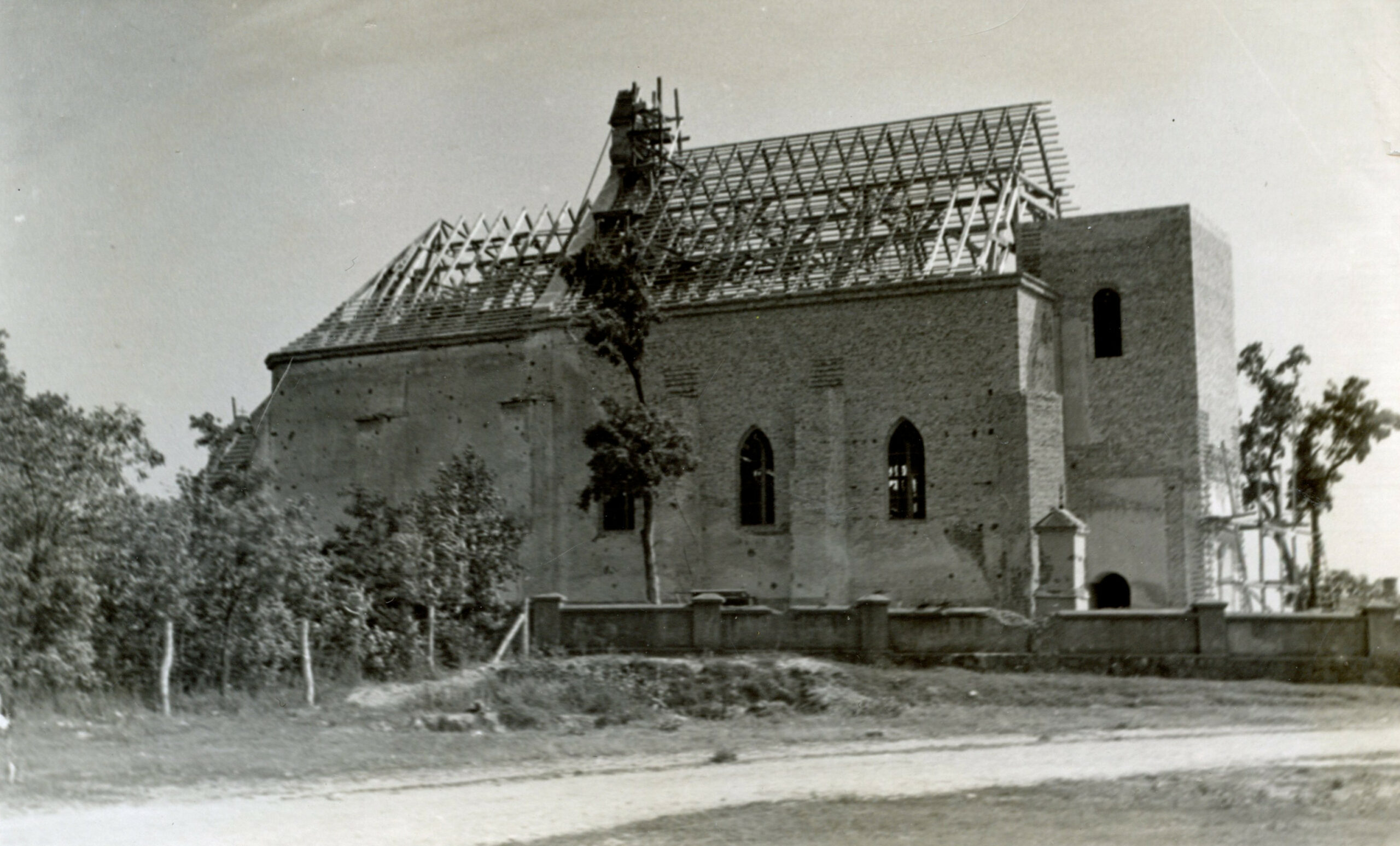 - 1945 r. – rozpoczęcie odbudowy przez księdza Stanisława Morawskiego, który niestety w wyniku zapalenia płuc spowodowanego dużym zaangażowaniem w prace budowlane, umiera w grudniu.