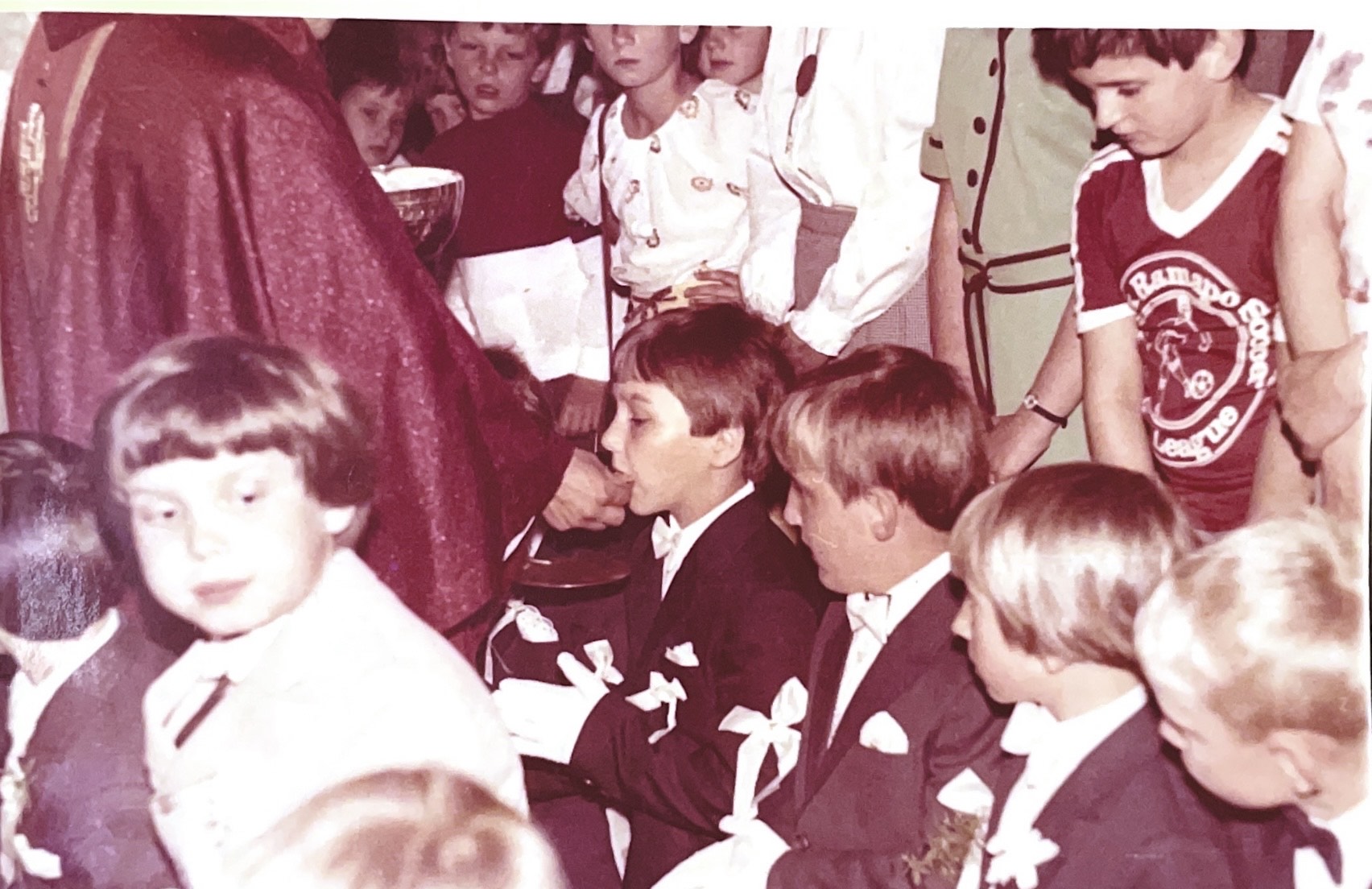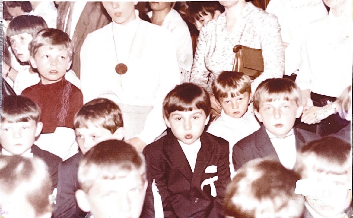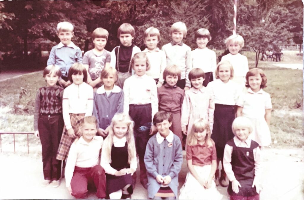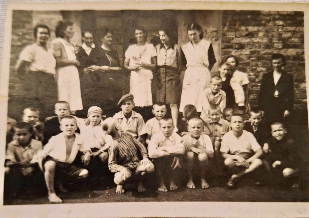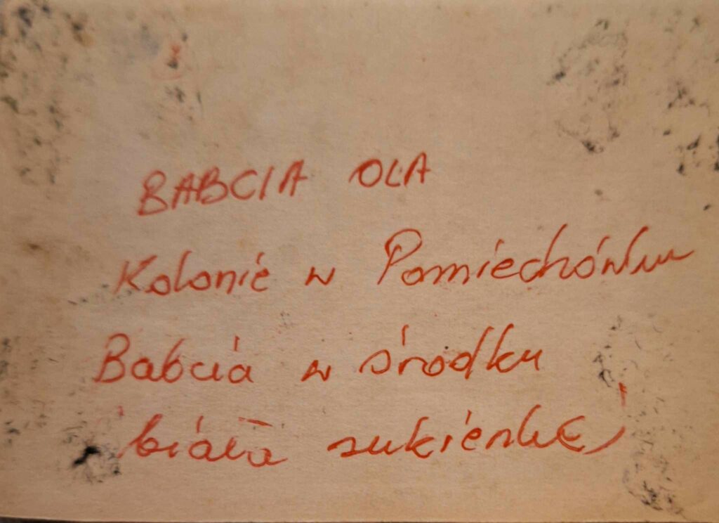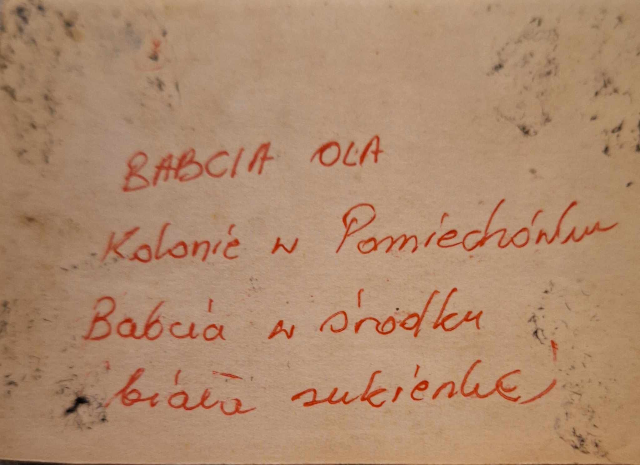 Zdjęcie zostało wykonane ok 1965 r. Kolonie letnie w Pomiechówku. Odbywały się w Szkole Podstawowej w Pomiechówku. Wśród kobiet stojących nad dziećmi, jest Aleksandra Sobieszek (stoi w środku w białej sukience). Pracowała tam sezonowo w czasie kolonii, robiła pranie na tarze i pomaagała w pracach kuchennych. Foto z albumu Igora Szubskiego.