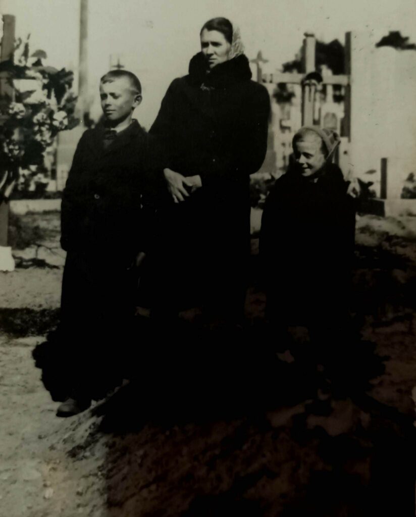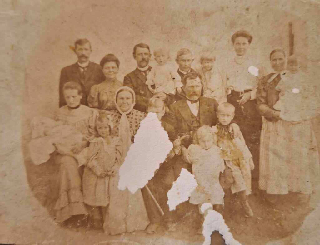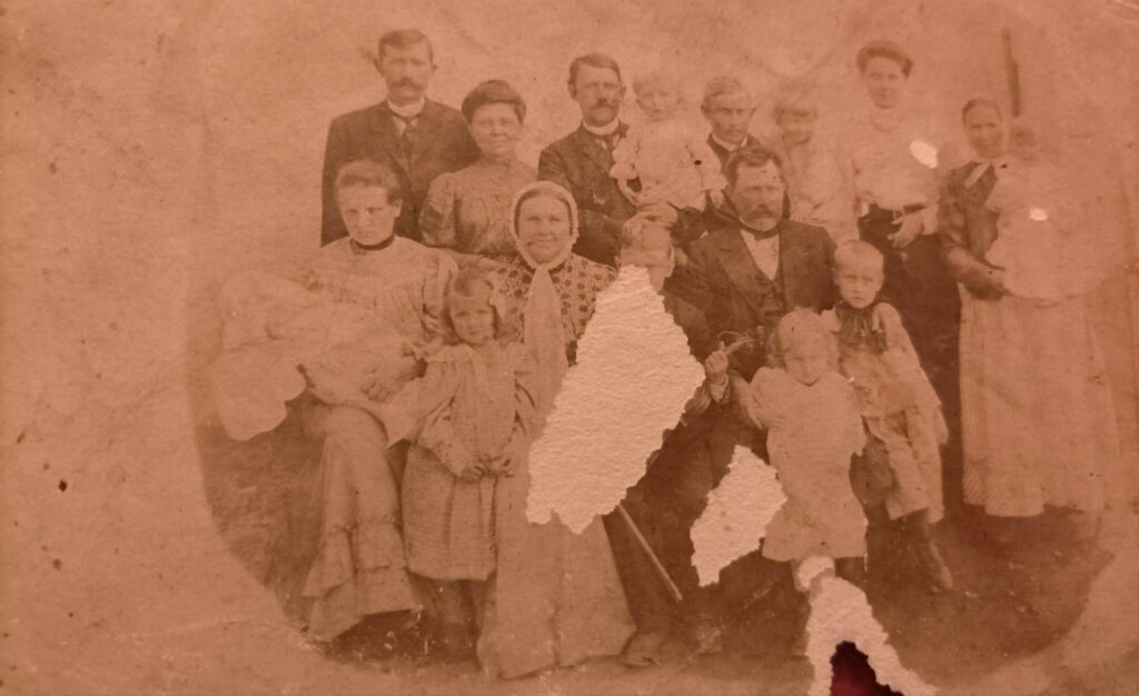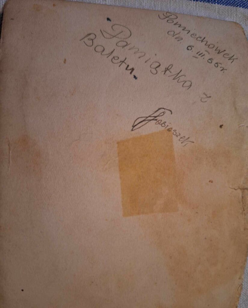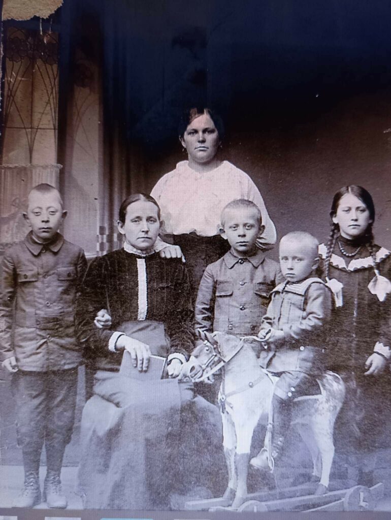 Około 1914 r. Zdjęcie rodzinne. Siedzący mężczyzna z wąsami to Jan Fulgenty Sobieszek (ur.1876 zm. 1942), mąż Zofii z d. Skorupska, przytulony do niego chłopiec to syn Jan Sobieszek (ur. 1909 r zm. po 1944 r. więzień KL Stutthof). Mieszkańcy Pomiechówka od około 1914 r. przeprowadzili się z Warszawy (Wawrzyszew) Pozostałe osoby nierozpoznane.