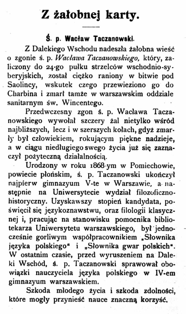 „W bitwie pod Saolincy na wzgórzach Landiausianskich pod Laojauem, śmiertelnie został raniony kulą w głowę s. p. Wacław Taczanowski, zmarły dnia 6 września r. b. w szpitalu polowym w Charbinie. Filolog, nauczyciel języka polskiego w IV gimnazjum męskiem w Warszawie, współpracownik „Słownika języka polskiego“ i „Słownika gwar polskich“, którego ukończenie miał sobie powierzone po śmierci s. p. Jana Karłowicza, cichy, sumienny pracownik, poświęcony wyłącznie sprawom swojej wiedzy, należał Taczanowski do najwybitniejszych sil naukowych młodszych. Urodzony w r. 1868 na wsi, w guberni Płockiej, z ojca Franciszka i matki Wiktoryi z Jankowskich, kształcił się w Warszawie w gimnazjum V, które ukończył w r. 1889. Zapisawszy się następnie na wydział lekarski, do roku 1902 studiował medycynę. Wątły i słabowity nie mógł jednak wytrwać w tych studyach i dla poratowania zdrowia musiał uniwersytet opuścić. Po dwuletnim wypoczynku powrócił do przerwanych nauk, ale już nie na medycynę. Rozpoczął studya historyczno-filologiczne, do których ciągnęły go wrodzone zdolności i upodobania. Wydział ten ukończył w r. 1897 ze stopniem kandydata. Poświęciwszy się językoznawstwu, rozpoczął pracę naukową wśród dobranego grona współpracowników „Słownika języka polskiego“ i w krótkim czasie zdobył sobie uznanie, jako zdolny i dobrze przygotowany lingwista. Dowodem tego uznania służyć może fakt, że po śmierci Jana Karłowicza, powierzono Taczanowskiemu materyały rękopiśmienne, pozostałe po zmarłym uczonym, a dotyczące „Słownika gwar polskich“, z tem, aby materyały te uporządkował, dopełnił na własną rękę, o ile tego zajdzie potrzeba i wydawnictwo doprowadził do końca. Okazało się, że Taczanowski był właśnie stworzony do takiej pracy. Rozmiłował się w niej, poświęcał jej całkowity swój czas poza zajęciami obowiązkowemi na stanowisku pomocnika bibliotekarza Biblioteki Uniwersyteckiej, a potem — nauczyciela języka polskiego, kładł w nią cały zasób swoich wiadomości i gorącą chęć przysłużenia się nauce. Niestety, śmierć przedwczesna nie pozwoliła mu rozpoczętego pod dobrą wróżbą dzieła ukończyć. Powołany, jako oficer rezerwy, na pole działań wojennych na Dalekim Wschodzie, padł w jednej z pierwszych utarczek pod Laojanem, pozostawiając po sobie szczery i głęboki żal wśród tych, którzy go mieli sposobność znać bliżej.”