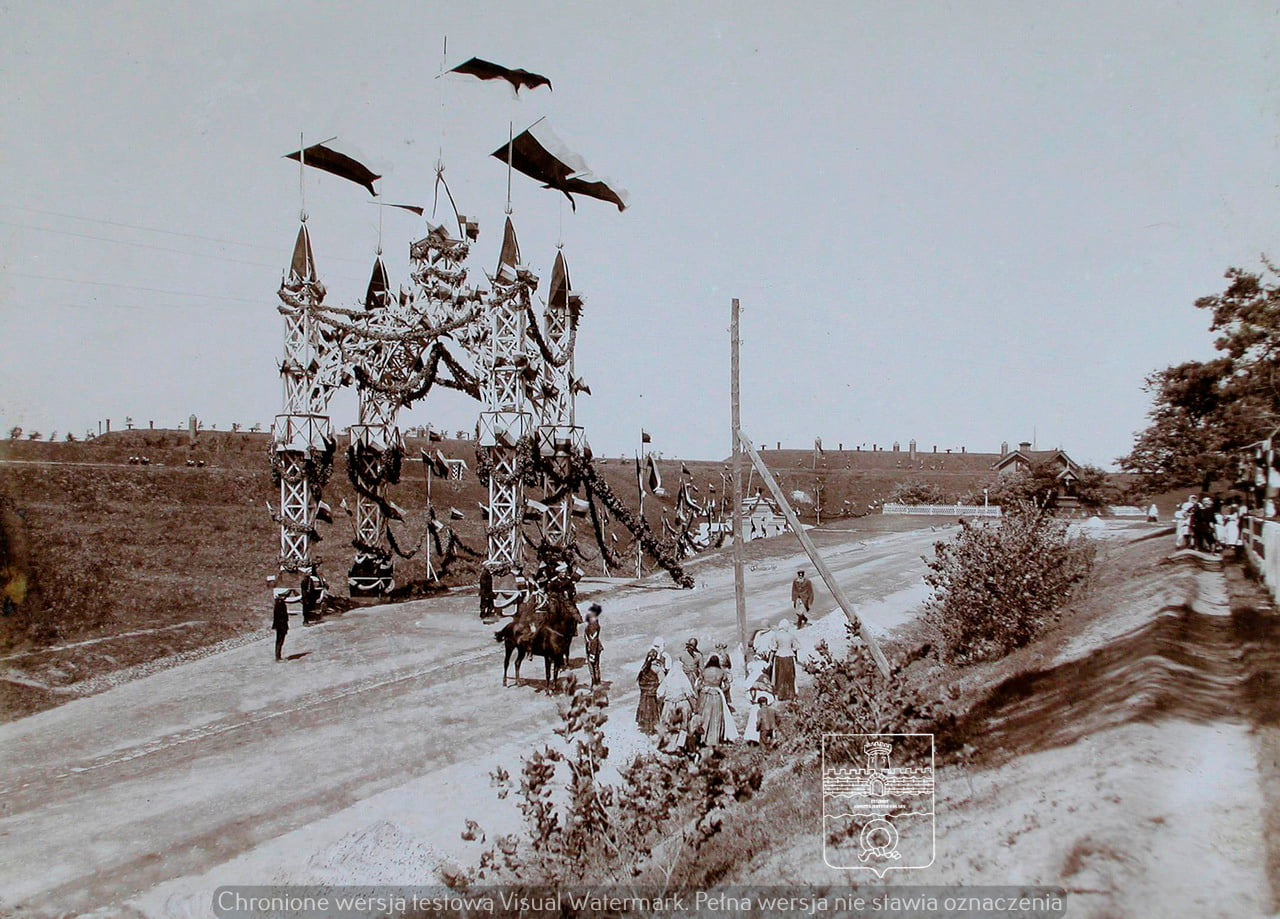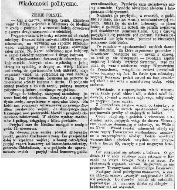 „(…) Ludność kolonii i okolicznych wiosek, nawet dość odległych, dowiedziawszy się o tem, że Najjaśniejsi Państwo przyjadą do kolonii, zajęła się przygotowaniem najuroczystszego i serdecznego przyjęcia. Na szosie, prowadzącej do kolonii, włościanie urządzili bardzo ładną bramę tryumfalną z zieleni, ozdobioną na wierzchu Cesarską koroną i różnokolorowemi flagami. Dzieci z miejscowych i okolicznych szkół umieściły się po obydwóch stronach drogi, zajmując całą przestrzeń od szosy do cerkwi. Wszystkie one były ubrane świątecznie i wszystkie z gorącem upragnieniem oczekiwały przyjazdu Najdostojniejszych Gości. Wiele z pomiędzy dzieci zebrało się i zajęło wskazane im miejsce od wczesnego ranka. Kiedy się ukazał powóz Cesarski, rozległy się w powietrzu długo nieustające okrzyki radości dorosłych i dzieci. Najjaśniejsi Państwo weszli do cerkwi, gdzie byli powitani przez miejscowego duchownego z krzyżem i święconą wodą. Po wyjściu z cerkwi Cesarzowi i Cesarzowej byli przedstawieni deputaci od włościan gubernii Płockiej dotkniętych powodziom; deputaci ofiarowali Najjaśniejszemu Panu swoją wdzięczność za Najwyżej okazaną im pomoc, która nie tylko uchroniła ich od grożącego głodu, ale nadto utwierdziła ich w przekonaniu, że wszyscy oni są dziećmi jednego Panującego Ojca, troszczącego się jednakowo o szczęście wszystkich swoich poddanych. Kiedy Najjaśniejsi Państwo skierowali się potem ku powozowi, znajdujący się tam uczniowie zaśpiewali Hymn narodowy i razem ze wszystkimi obecnymi napełnili okolicę całą uroczystemi okrzykami. Z kolonii Aleksandryjskiej Najdostojniejsi Podróżni udali się do jednej z warowni (fortów), położonych w pobliżu twierdzy. Przy wejściu do fortu Najjaśniejszych Państwa powitało trzy tysiące rosyjskich włościan, grabarzów sprowadzonych z wewnętrznych guberni Cesarstwa do robót ziemnych. Robotnicy ci ofiarowali Najjaśniejszym Państwu chleb i sól na drewnianych taczkach, które choć były pięć razy mniejsze od prawdziwych taczek, były jednak dość wielkich rozmiarów, a przytem okute srebrem. Zamiast solniczki włościanie ofiarowali małe wiaderko z łopatką, jakie się używają przy robotach ziemnych. Robotnik, który podawał chleb i sól, włościanin Aleksy Kowalew, powiedział: :Ojcze Cesarzu i Matko Cesarzowo! Z łaski Bożej zaszczyceni zostaliśmy wielkiem szczęściem ujrzenia i powitania dla każdego Rosyanina Osób Waszych. Przyjmijcie nasze włościańskie chleb i sól oraz zapewnienie nieograniczonej miłości i niezachwianej wierności naszej, którą wraz z krwią przekażemy dzieciom i wnukom naszym. Niechaj Wszechmogący Pan Bóg ześle Wam długie, spokojne i szczęśliwe życie na pomyślność i wyniesienie naszej rodzonej matki Rosyi, na pomyślność i szczęście wiernopoddanych dzieci Waszych.”. Jego Cesarska Mość, przyjąwszy łaskawie chleb i sól, uprzejmie rozmawiał z robotnikami. Potem Cesarz wraz z Cesarzową oglądał prowadzące się roboty ziemne. Włościanie i dzieci, które witały Najjaśniejszych Państwa z kolonii Aleksandryjskiej, dowiedziawszy się, że Najdostojniejsi Podróżni z powrotem pojadą tąż samą drogą, t.j. przez kolonję, nie chcieli odejść i i pozostali na dawnych miejscach, spodziewając się jeszcze raz powitać Koronowanych Gości. I rzeczywiście nie wiele upłynęło czasu, kiedy głośne, a coraz więcej zbliżające się okrzyki: hura! dały znać o powrocie Najjaśniejszych Państwa. Wtedy już wszyscy w nieładzie rzucili się zajmować miejsca po obydwóch stronach szosy, pragnąc być jak najbliżej powozu. Kiedy zaś Najjaśniejsi Państwo się oddalili, naród również żegnał Cesarza i Cesarzową. I potrzeba było kazać zebranym rozchodzić się, w przeciwnym bowiem razie byliby oni jeszcze długo pozostali na zajętych przez siebie miejscach. Większa ich część powracała do domu z kwiatami lub gałązkami zieleni, podjętemi z ziemi na pamiątkę uroczystego dla nich dnia Najwyższych odwiedzin.”